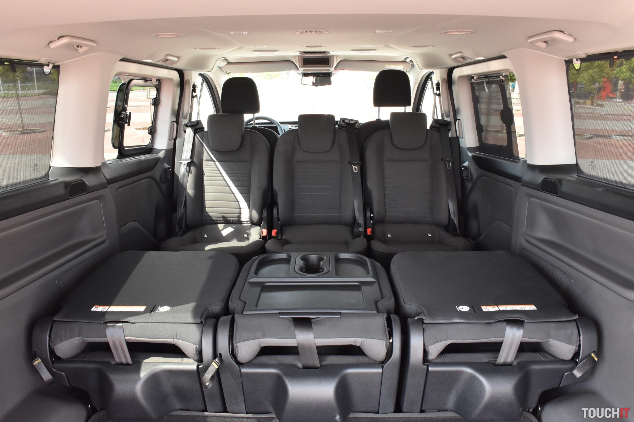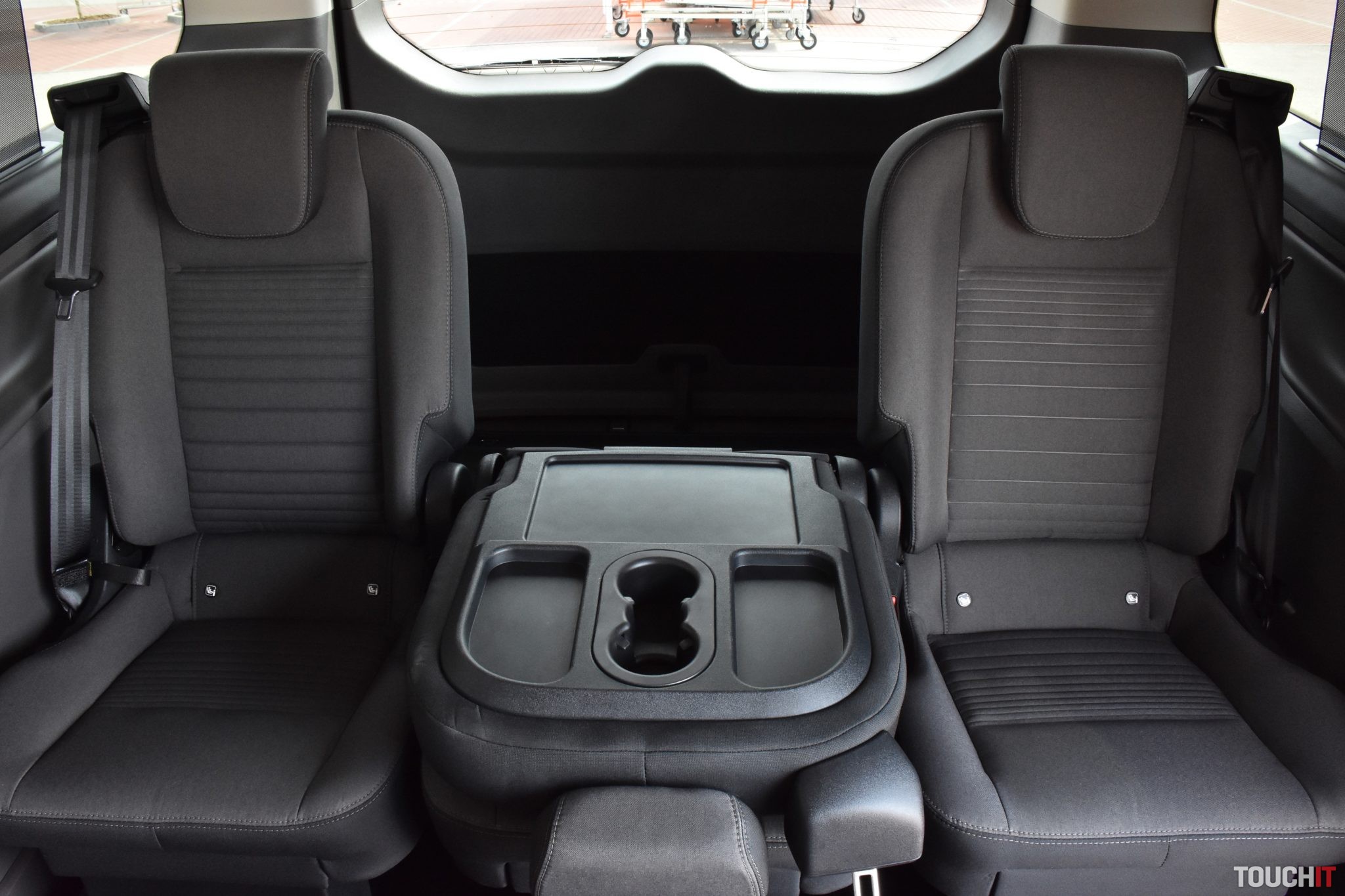 Dizajn príliš rozoberať nebudem, ten je subjektívnou záležitosťou a každý v ňom vidí svoje pozitíva a negatíva. Je však dobré vedieť, že od predošlej generácie sa nový model diametrálne nezmenil. Rozdiely vidieť na prvý pohľad, ale podstata a charakter tohto modelu zostal zachovaný. V prednej časti je najväčšou zmenou nová maska, ktorá korešponduje s aktuálnym dizajnovým jazykom automobilky Ford a musím uznať, že v chrómovom prevedení vyzerá veľmi dobre – dodáva mu štýl. Po bokoch masky sú mohutné svetlá so zmenenou grafikou, pričom nechýba ani zaujímavý svetelný podpis denného LED svietenia, ktoré určite neprehliadnete. Trošku ma prekvapilo, že Ford do inovovaného modelu neintegroval LED svetlomety, ale zostal verný Bi-Xenónom, ktoré síce svietia výborne (stretávacie aj diaľkové), ale predsa len je LED technológia značne ďalej. Snáď v ďalšej generácii. Prítomné sú aj hmlové svetlomety s funkciou prisvietenia zákrut. Koncové svetlomety zostali takmer nezmenené. Profil karosérie je verný predchodcovi, čo je dobre, ale má to aj svoje nevýhody. Základom sú masívne predné dvere, ktoré dopĺňajú obrovské posuvné dvere v strede karosérie (z oboch strán). Posuvné dvere sú praktické a v tomto prípade aj nutnosťou, ale majú značnú váhu, takže deti a útlejšie ženy s nimi budú občas bojovať. Zachovaný zostal aj vonkajší schodík pod prahom, vďaka čomu sa do zadnej časti lepšie nastupuje. Z profilu vyzerá tento model veľmi dobre, začo môže hlavne celistvá horná polovica, ktorá je takmer celá presklená. Aby bol dosiahnutý oku lahodný celok, tak medzi prednými a zadnými oknami je na „B“ stĺpiku nalepená čierna fólia. Orientácia na dizajn má nevýhodu v tom, že zadní pasažieri majú k dispozícii iba malé krídlové okienka. Z toho vyplýva, že posádka v 2 a 3 rade sa musí spoliehať iba na klimatizáciu, čo nie je ideálne. Zadná časť zostala takmer nezmenená – stále sú prítomné obrovské kufrové dvere, ktoré sa vďaka silným plynovým vzperám otvárajú veľmi ľahko. Po otvorení môžu slúžiť ako strieška pri rôznych aktivitách, napr. v kempe, na rybačke a pod.
