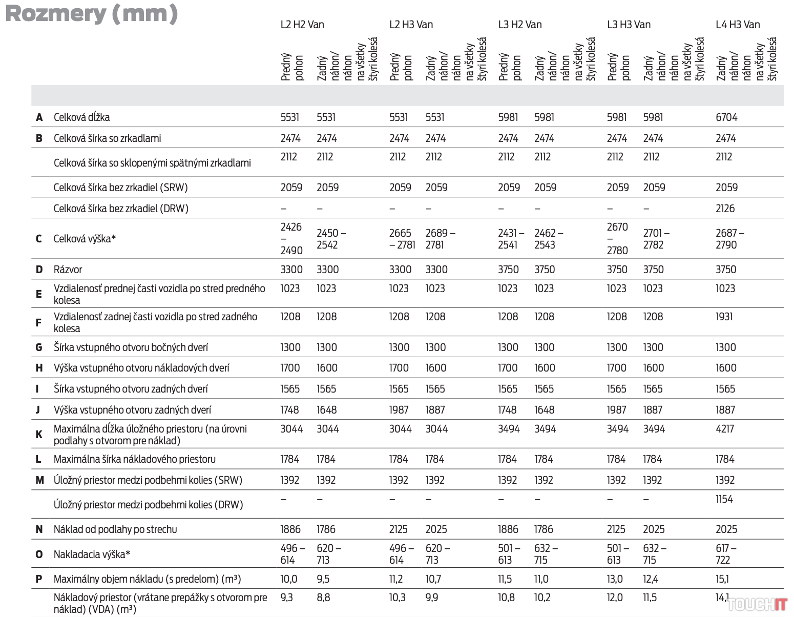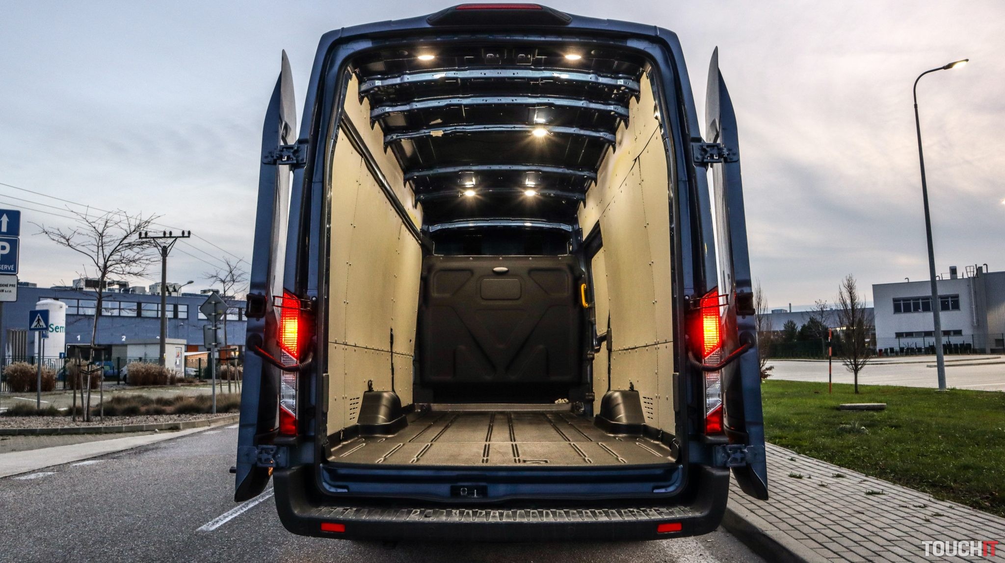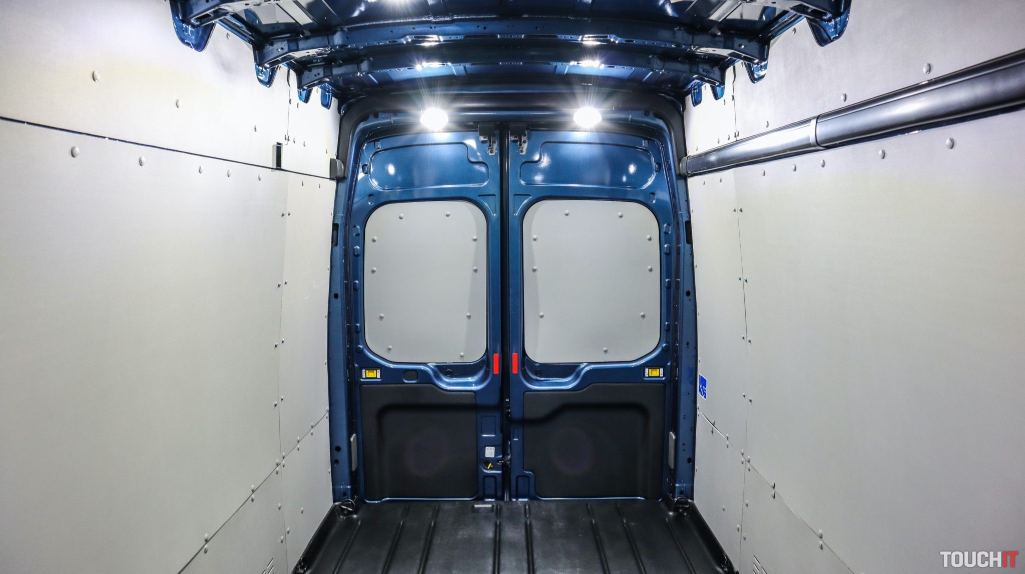 „Nákladný priestor ponúka v predĺženej verzii L4H3 objem približne 15,1 m3 (5 euro paliet – 183 mm navyše k dĺžke a zmestilo by sa ich 6, škoda), teda aj extra vysoký strop. Určite odporúčame príplatkové LED osvetlenie, ktoré krásne presvetlí celý priestor – počas nakladania materiálu je to skvelé. Samozrejmosťou sú veľké bočné posuvné dvere (môžu byť aj elektricky ovládané) a zadné 2-krídlo s otváraním do 236° a magnetickou aretáciou. Okrem toho nechýbajú ani kotviace body v podlahe + odkladací priestor na drobnosti nad priestorom kabíny. Testovaný model mal zakrytované boky preglejkami a plastovú podlahu, ktorú by sme vymenili za drevenú – ťažké palety by plastovú podlahu čoskoro poškodili a ťažko by sa posúvali.“
