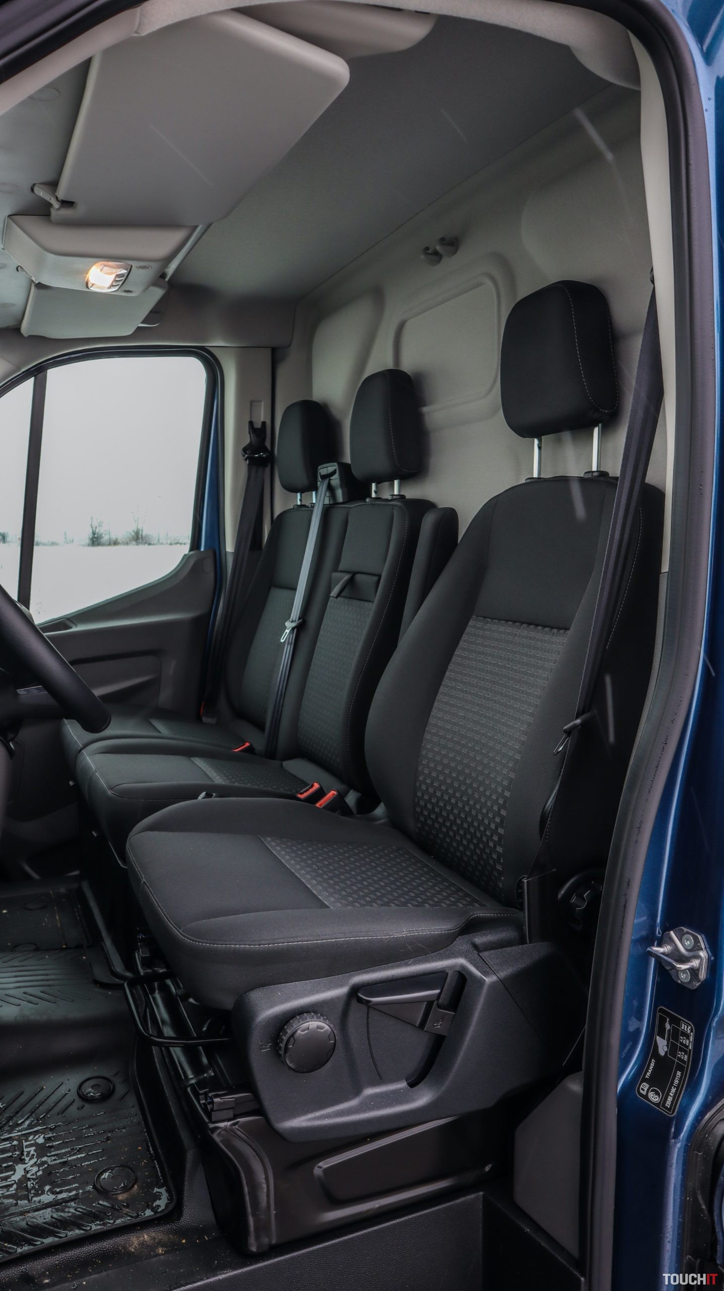 Ak trávite v úžitkovom vozidle veľa času (medzinárodná, vnútroštátna preprava a pod.), tak je veľmi dôležité vyhotovenie interiéru, odkladacie priestory a hlavne sedenie. Odsedel som si tu počas týždňa dosť času a bol som spokojný, teda moja zadnica a chrbát, čo je prvý úspech, no ak by som tu mal sedieť v rámci práce denne, tak by som si prial odpružené sedadlo, ktoré je predsa len pohodlnejšie. Inak sú možnosti nastavenia polohy sedadla výborné a k priestoru za volantom nemám výhrady (sedadlá majú novú konštrukciu, ktorá zvyšuje pohodlie, nakoľko využíva upravenú penovú výplň a geometriu pre optimalizovanú oporu). Keďže mám 2 metre, tak pravé koleno si v každom aute tohoto typu odieram o konzolu radiacej páky, to je ale čisto subjektívne. Dodajme, že nové sú aj textílie, teda poťahy sedadiel, ktoré boli podľa výrobcu podrobené extra náročným testom odierania.