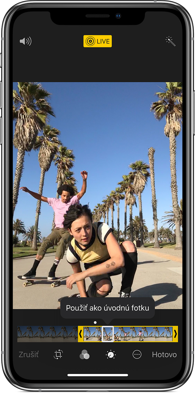 V spodnej lište úprav kliknete na ikonu Live Foto (tri kruhy) a následne si môžete vybrať úvodnú fotku danej sekvencie, prípadne túto sekvenciu skrátiť a pod. Trošku sa to podobá na sériové snímanie, takže si vo výsledku môžete vybrať najkrajšiu časť sekvencie a použiť ju ako klasickú fotku. Live Foto sa dá použiť aj ako pohyblivé pozadie. Toto je jedna časť úprav, tá menej zaujímavá.