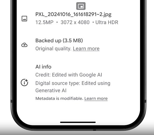 Google informuje, že všetky fotografie upravené pomocou AI nástrojov spoločnosti, ako sú Magic Eraser, Magic Editor a Zoom Enhance, už obsahujú metadáta IPTC, ktoré informujú, že obrázky sú upravené pomocou generatívnej AI. V aplikácii Fotky Google bude tak vidieť nielen štandardné informácie o fotografiách, ale aj informácie o tom, či bolo s fotografiou manipulované pomocou umelej inteligencie. Funkcia však do popisu obrázka pridá nielen novú sekciu AI Info s informáciami o pôvode obrázka, ale aj metadáta IPTC pre obrázky generované pomocou AI.