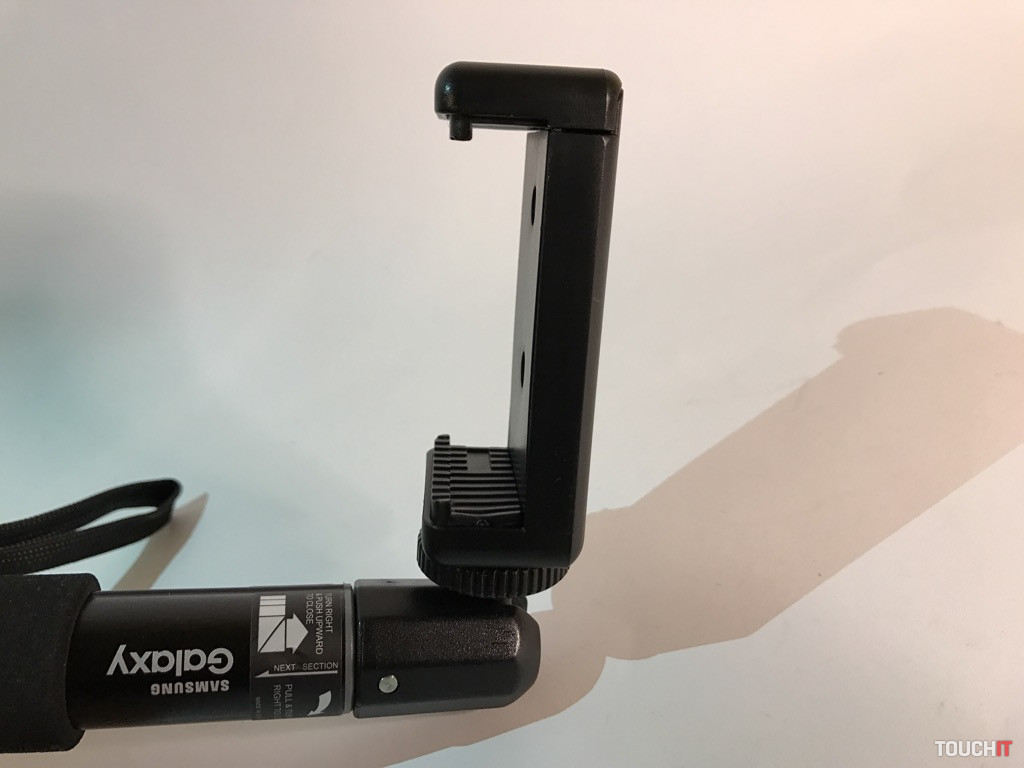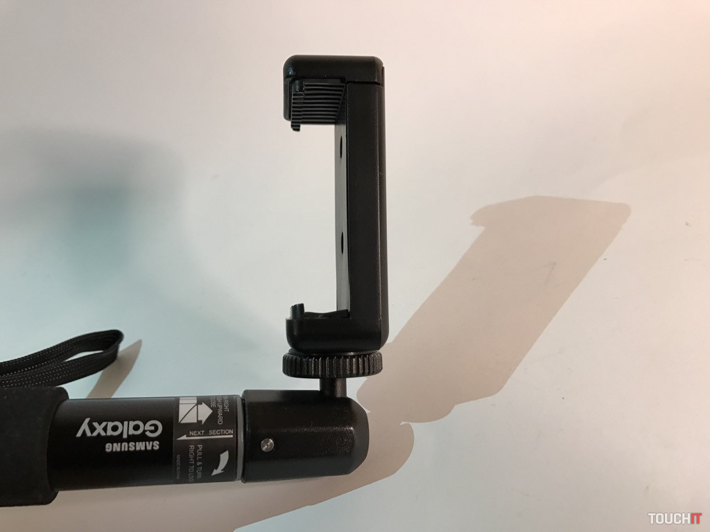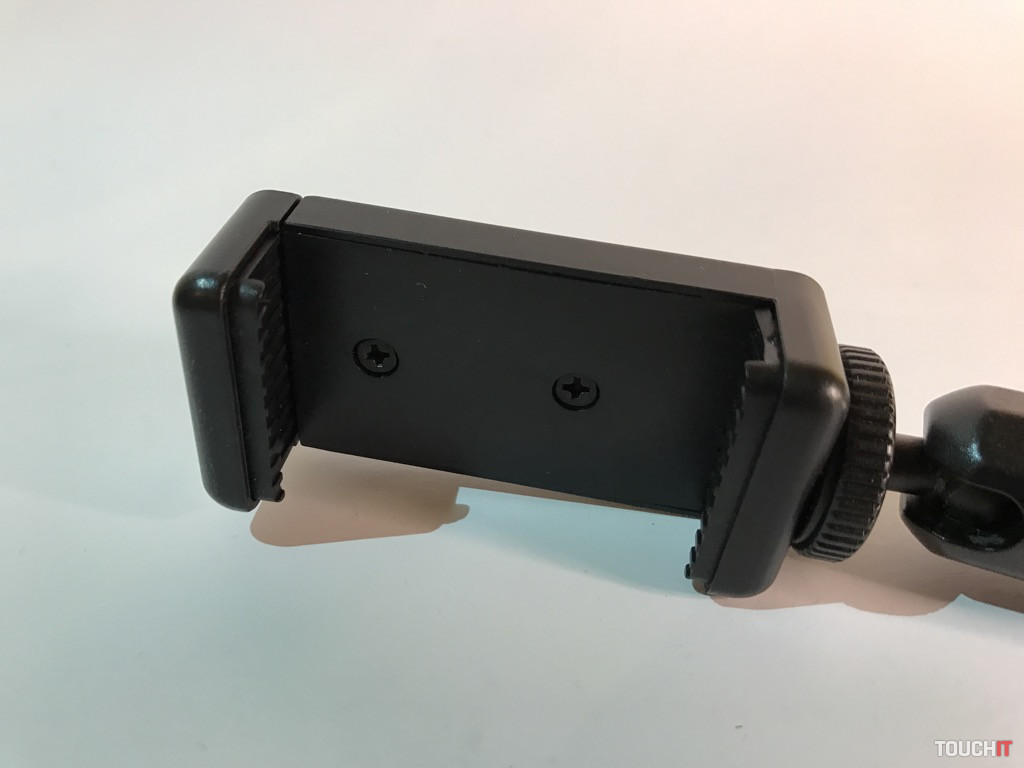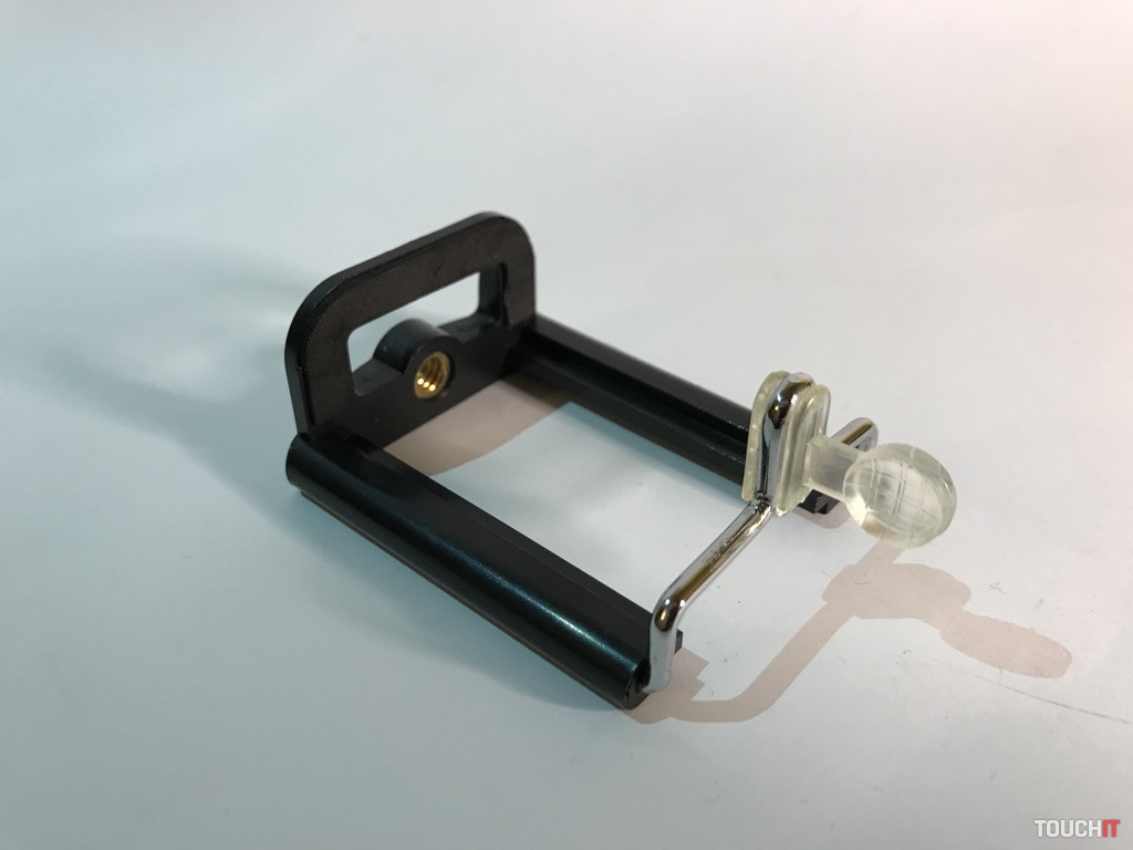 Okrem samotnej selfie tyče je v balení aj plastový držiak pre smartfóny. Ten má dve možnosti uchytenia na 1/4“ skrutku – zospodu a zozadu. Ktorou stranou držiak namontujete je jedno, pričom stále zostáva jeden 1/4“ závit voľný. To je vhodné nato, ak chcete k držiaku pridať nejaké iné príslušenstvo – svetlo, väčší mikrofón a pod. Možností je veľa, stačí mať štipku technického myslenia. Dodajme, že držiak pojme aj väčšie zariadenia, ako napr. iPhone 7 Plus s puzdrom (max. 87 mm).