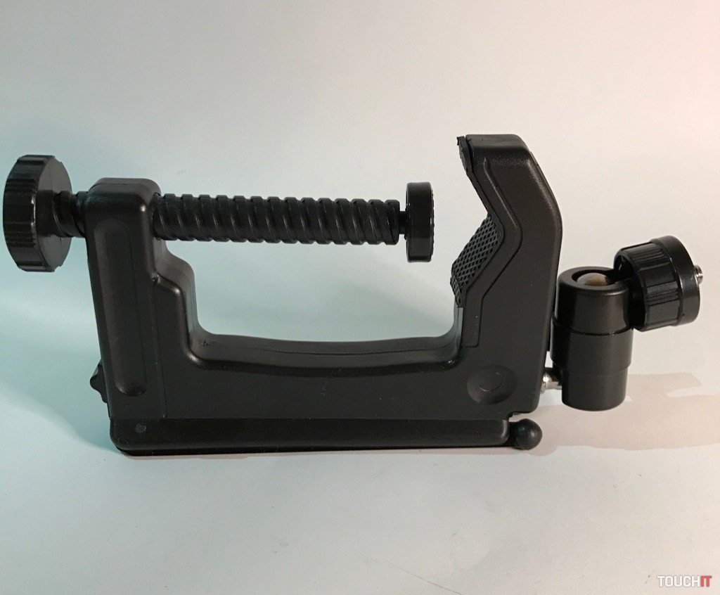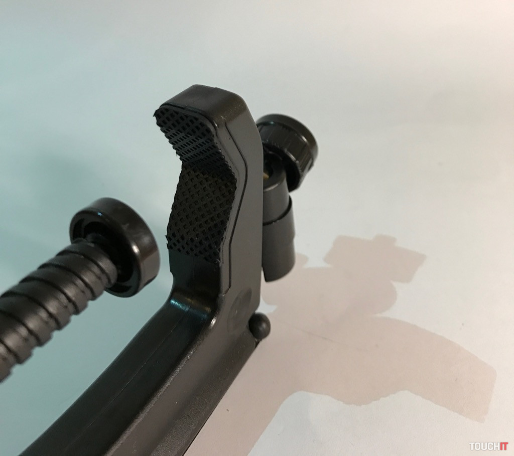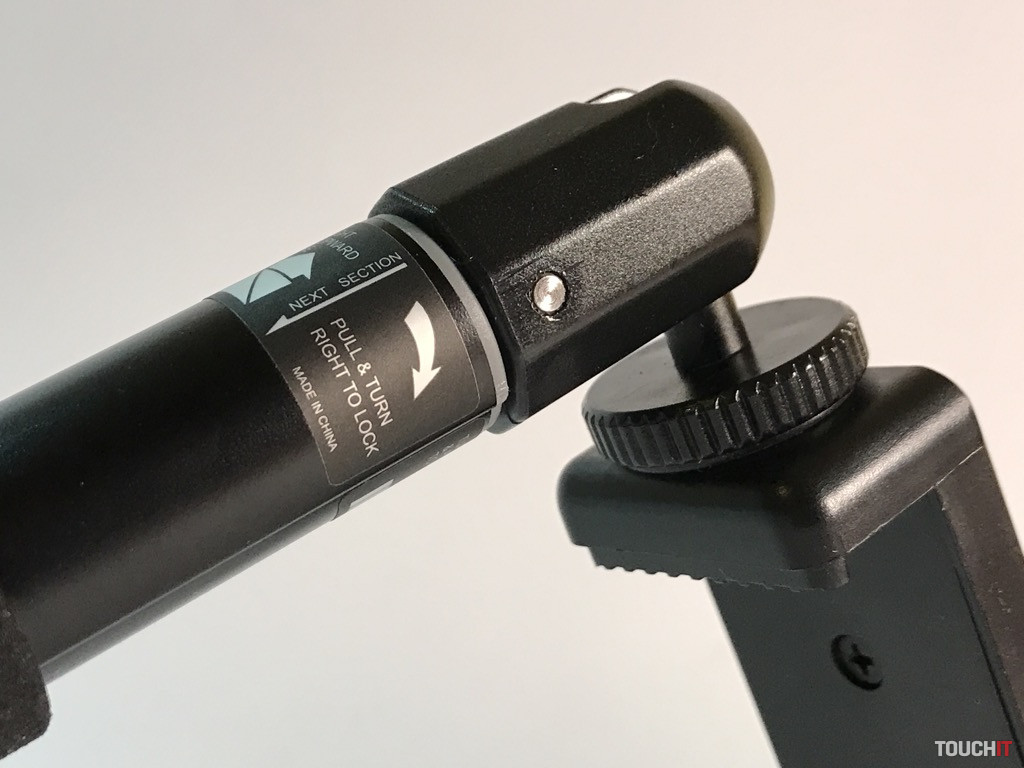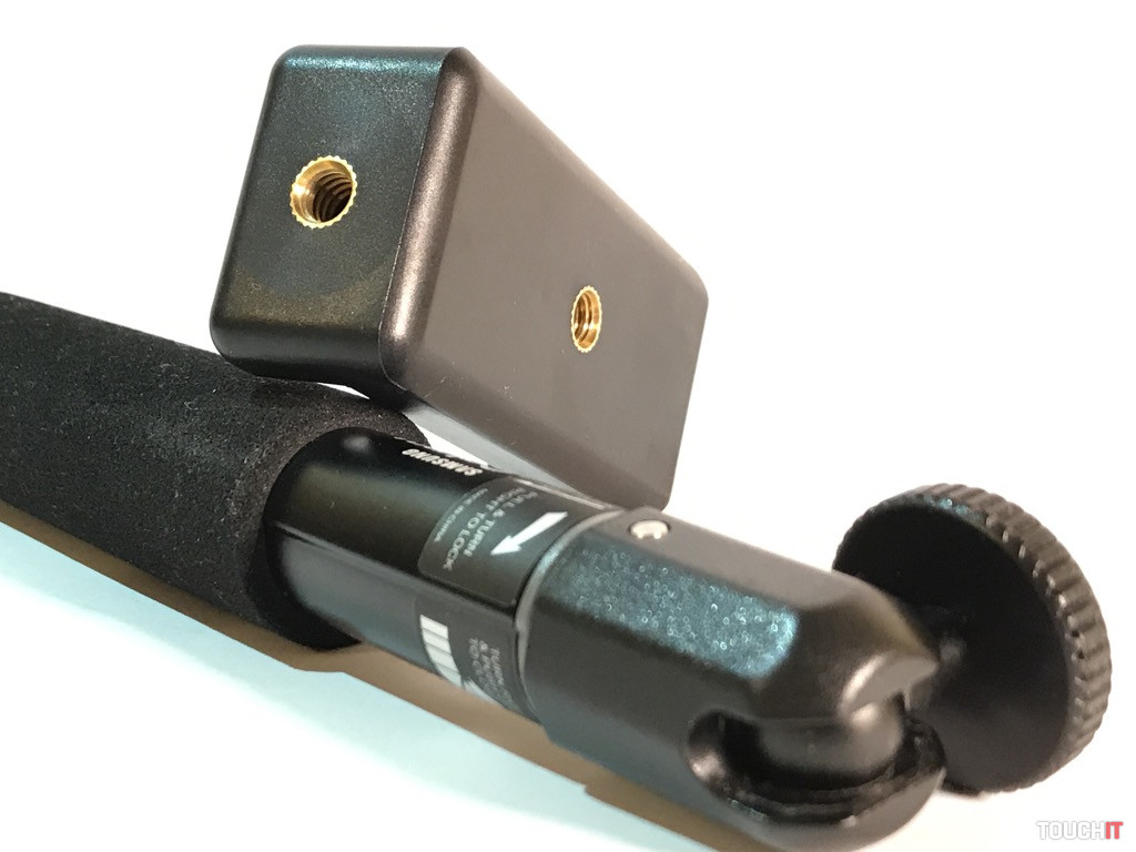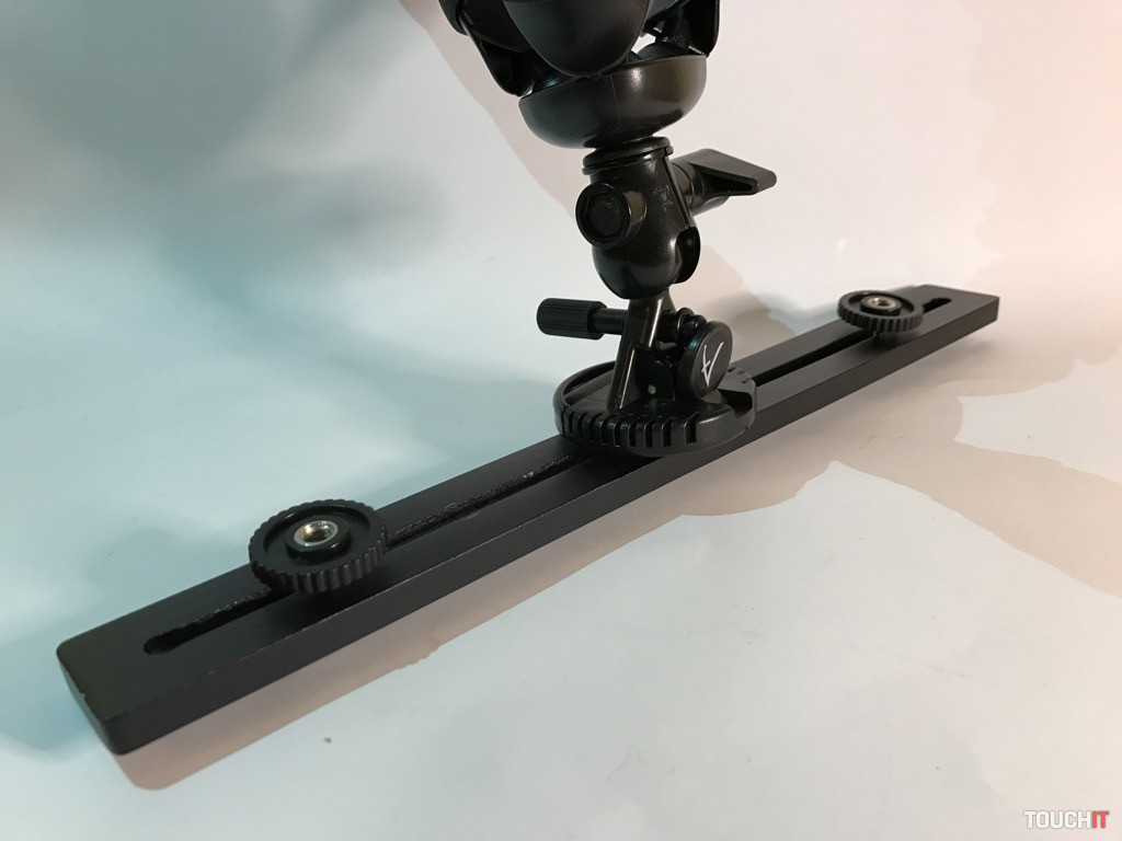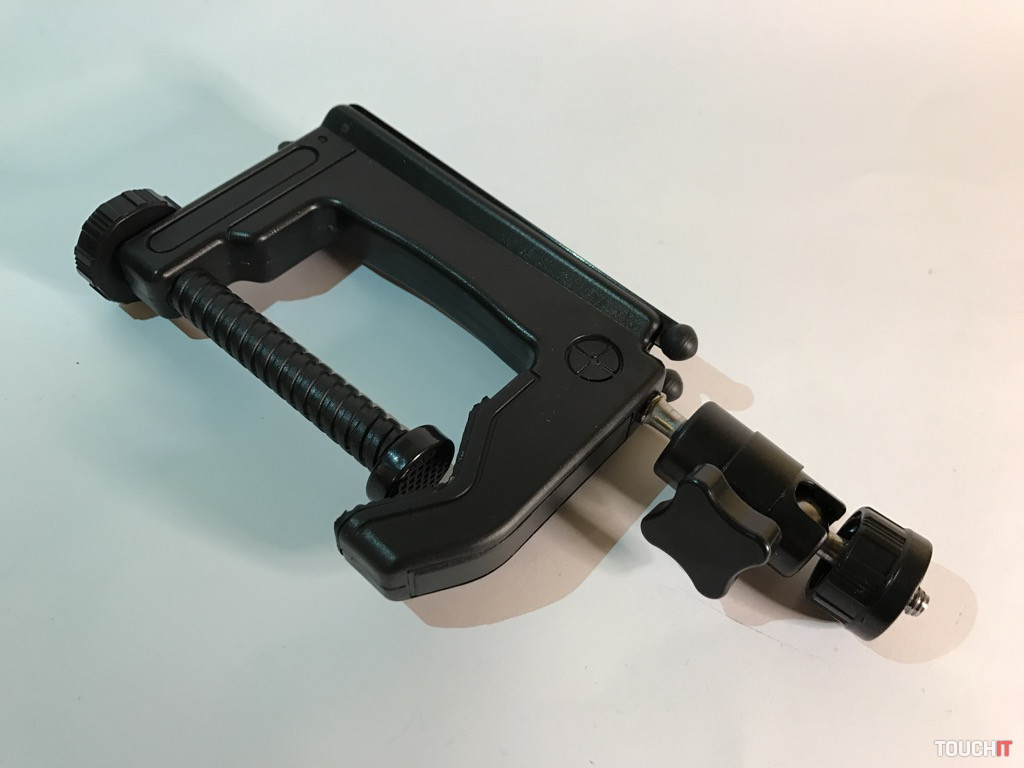 Týmto spôsobom je zabezpečená spoľahlivosť a stabilita zariadenia pri práci, čo je podstatou. Všetky časti, ktorých úlohou je fixovať, majú protišmykovú úpravu. Vo vrchnej časti sú dva kovové kĺby, stredová časť s aretáciou a klasický 1/4“ závit. Zariadenie je dostatočne pevné a stabilné, aj keď sa to na prvý pohľad nemusí zdať. Dá sa použiť mnohými spôsobmi a nakombinovať ho s inými zariadeniami, napokon sa výborne drží aj v ruke.