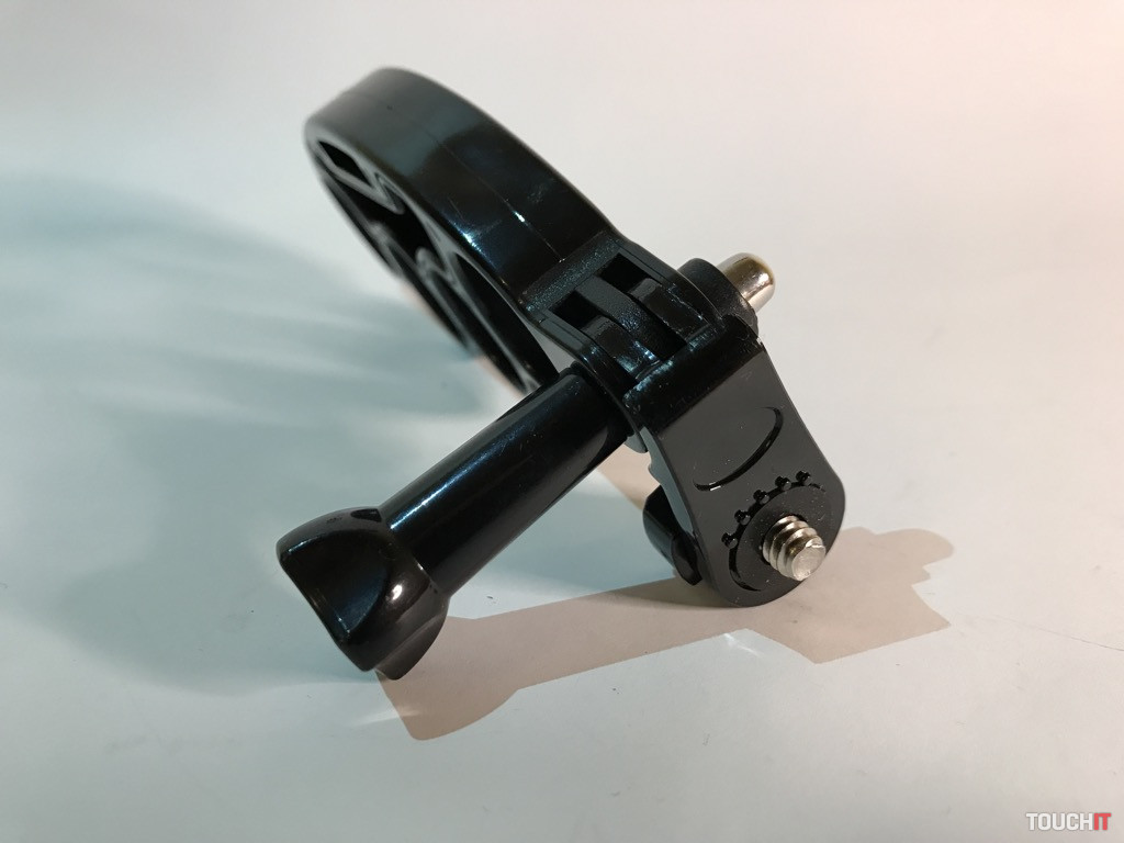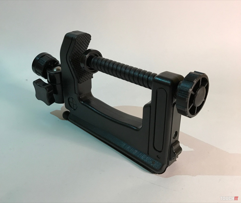 Druhý, menší držiak, je celoplastový, ale taktiež dobre použiteľný. Uchytenie na statív alebo iné príslušenstvo má iba zozadu (1/4“ závit), takže má iné možnosti prispôsobenia. Treba však povedať aj to, že nemá natoľko pevný úchop (strunu) a treba dávať pozor nato, aby z neho zariadenie pri manipulácii nevypadlo. Vhodný je skôr ako záložný, alebo na rôzne iné príslušenstvo – svetlo a pod.