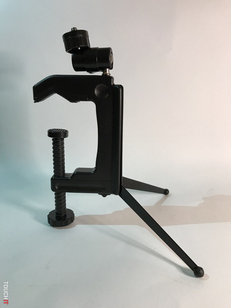 Jednoducho hybrid, ktorý si ihneď získal našu pozornosť. Toľko spôsobov použitia a konfigurácie, ako má tento produkt, sa len tak ľahko nevidí. Zariadenie je z odolného plastu, pričom nožičky a kĺby s aretáciou sú kovové. Výhodou je skladnosť, dve kovové nožičky sú sklápateľné a treťou nohou je veľká plastová skrutka, ktorá má okrem funkcie nohy aj aretačnú funkciu. A to vtedy, ak chcete statív prichytiť o trubku, stôl a pod. kovové nohy sú po otvorení zafixované a poistené, pri sklápaní je nutné odistiť zámok.