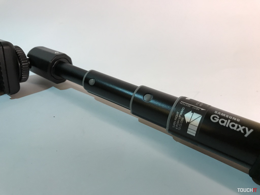 Samsung nevyrába len smartfóny, ale aj zaujímavé príslušenstvo k nim. Selfie tyč z produkcie tohto výrobcu sme si obľúbili kvôli jej jednoduchosti. Nemá Bluetooth ovládanie a je zhotovená z plastu a hliníka. Tyč je odolná a disponuje hliníkovou hlavou na kĺbe, s ideálne veľkou doštičkou, ktorá je ukončená 1/4“ skrutkou pre rôzne príslušenstvo. Podstatnou súčasťou je 1/4“ závit v spodnej časti rukoväte, čo umožňuje tyč kombinovať so statívom a iným vyššie uvedeným príslušenstvom (v našom prípade). Doplnkom je šnúrka na zápästie v balení. Tyč je zložená zo štyroch segmentov, ktoré sa aretujú otočným systémom. Ten je, subjektívne, najideálnejší. Max. dĺžka je 482 mm / min. 182 mm s hmotnosťou 80 gramov.