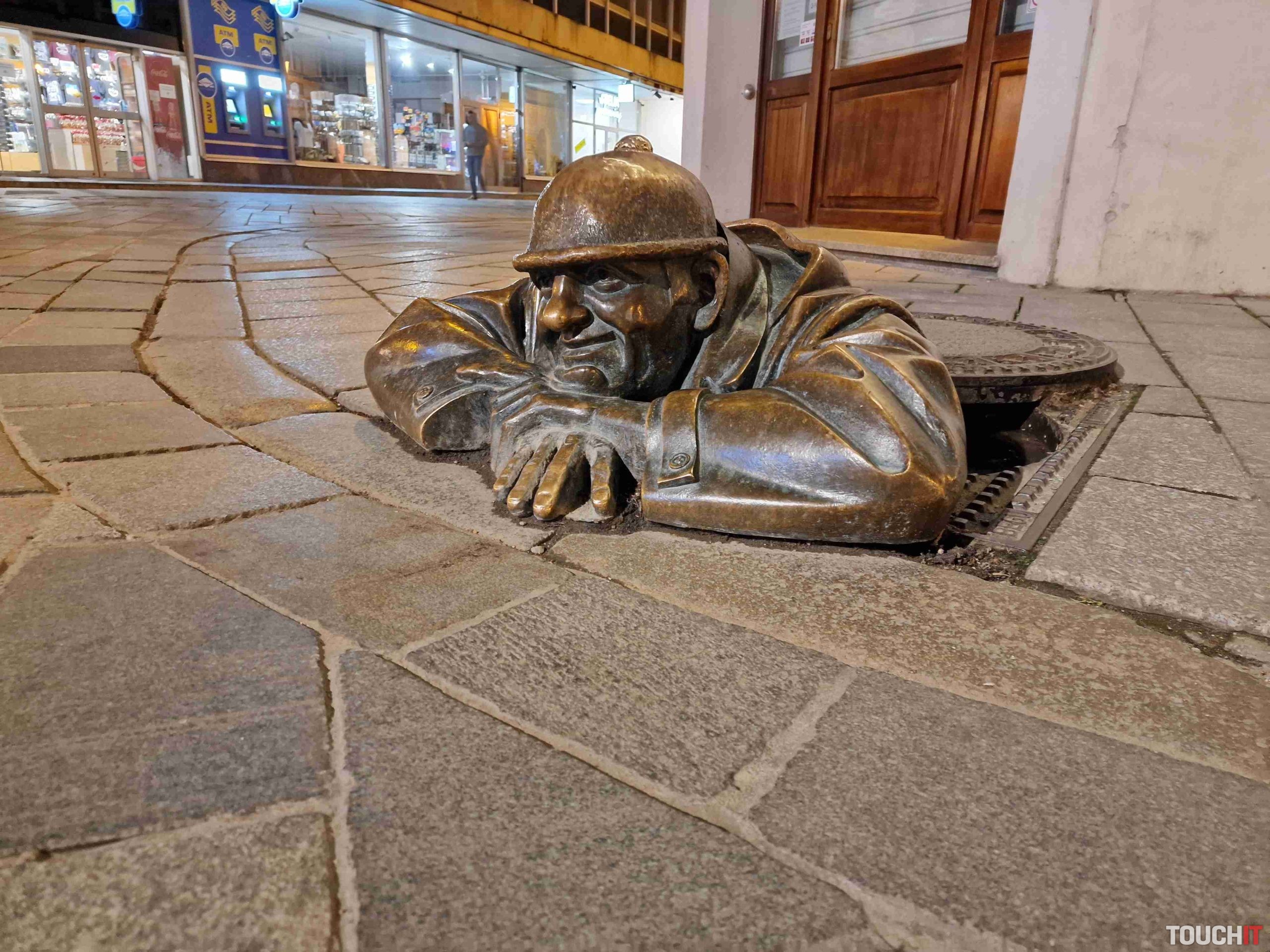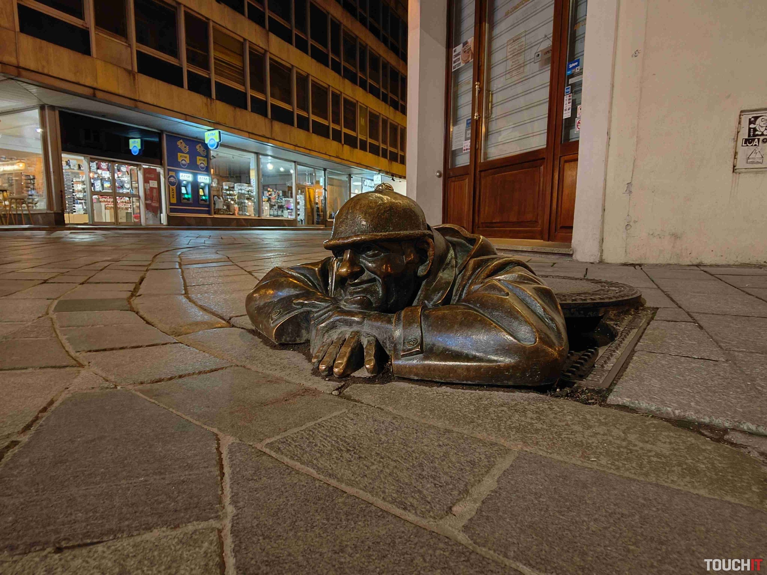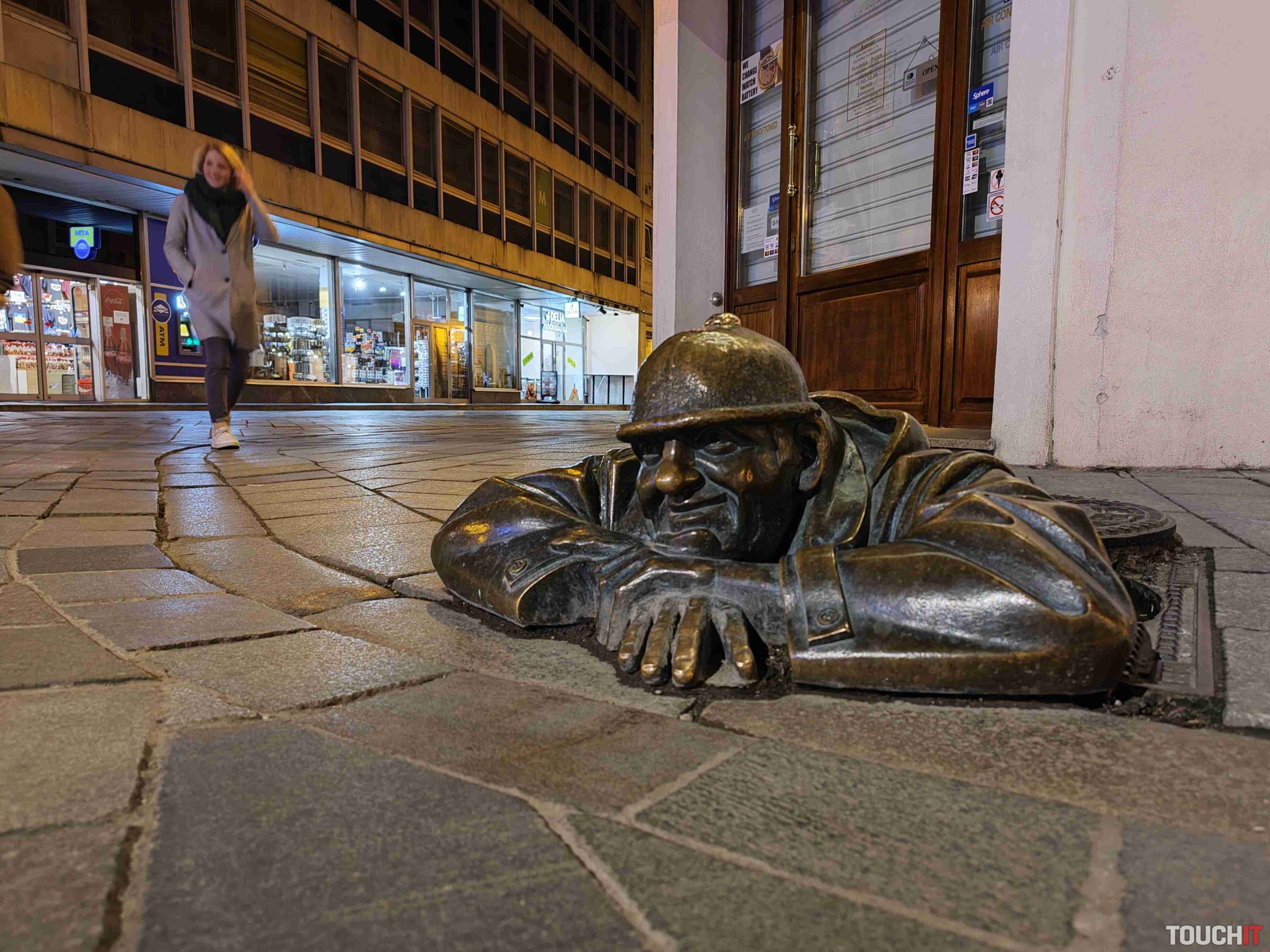 V tomto prípade sa naplno prejavili vlastnosti OPPO Find X5 Pro. Tento telefón má aj špeciálny grafický procesor na spracovanie fotografií. V jeho prípade je tak výsledkom skutočná (nepresvietená) noc, ale aj s detailmi tváre. Dobre je rozpoznať detaily v tieňoch a farebne odpovedá fotka skutočnosti. Približuje sa k nemu výsledok z Xiaomi 12 Pro. Napr. Galaxy S22 Ultra tu však scénu až príliš presvietil, na druhej strane nájdete tu všetky detaily.