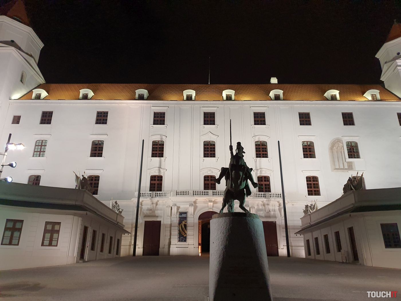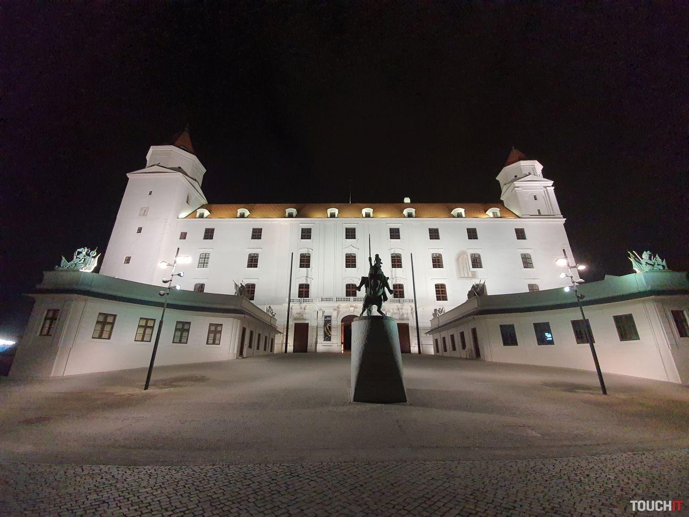 Porovnanie ultraširokouhlých fotoaparátov v noci. Hrad je dobre osvetlený, takže iPhone zatiaľ ako-tak drží krok s konkurenciou, aj keď pomaly zaostáva. Na fotkách sú dobré zachytené detaily okien v pozadí.