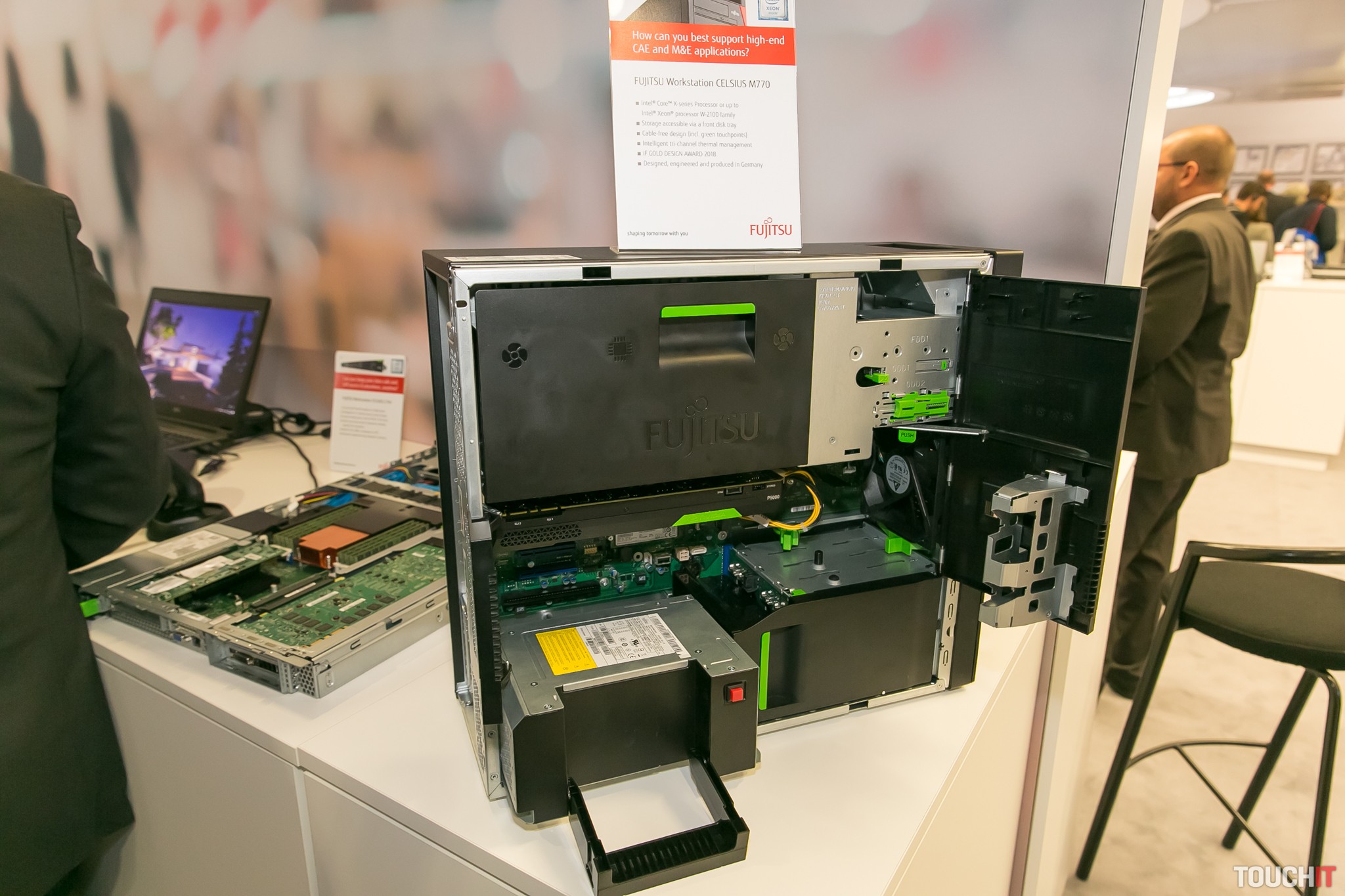 Pozreli sme sa aj na podnikové počítače, ktoré sa vyznačujú tým, že s ich komponentami sa dá manipulovať bez tohto, aby ste museli použiť nejaký nástroj. Príkladom je pracovaná stanica CELSIUS M770. Tá obsahuje procesor Intel Core X až Intel Xeon z rodiny W 2100. Pevné disky sú dostupné z prednej časti pracovnej stanice a dajú sa vymieňať za prevádzky. Výrobca venoval veľkú pozornosť aj chladeniu celého počítača, ide o efektívny trojkomorový chladiaci systém. Táto pracovná stanica je vyrábaná výhradne v Nemecku. Na našich fotkách je jasné, ako jednoducho sa vymieňajú jeho komponenty.