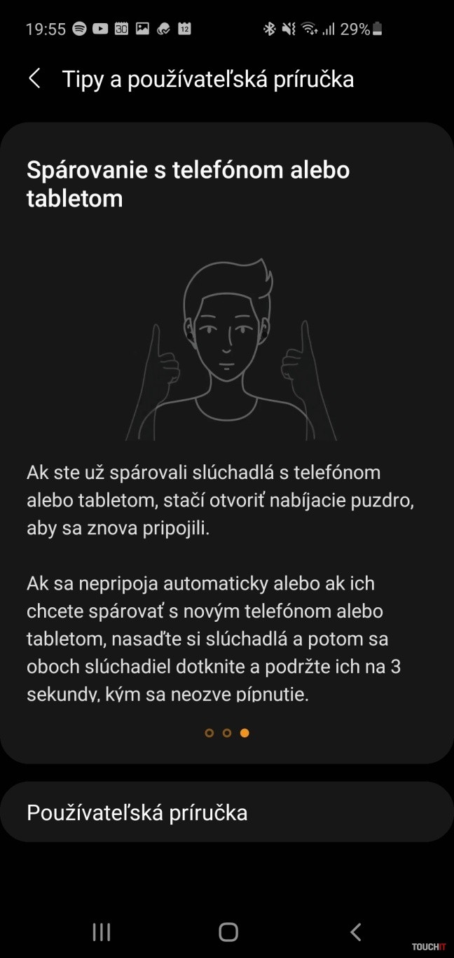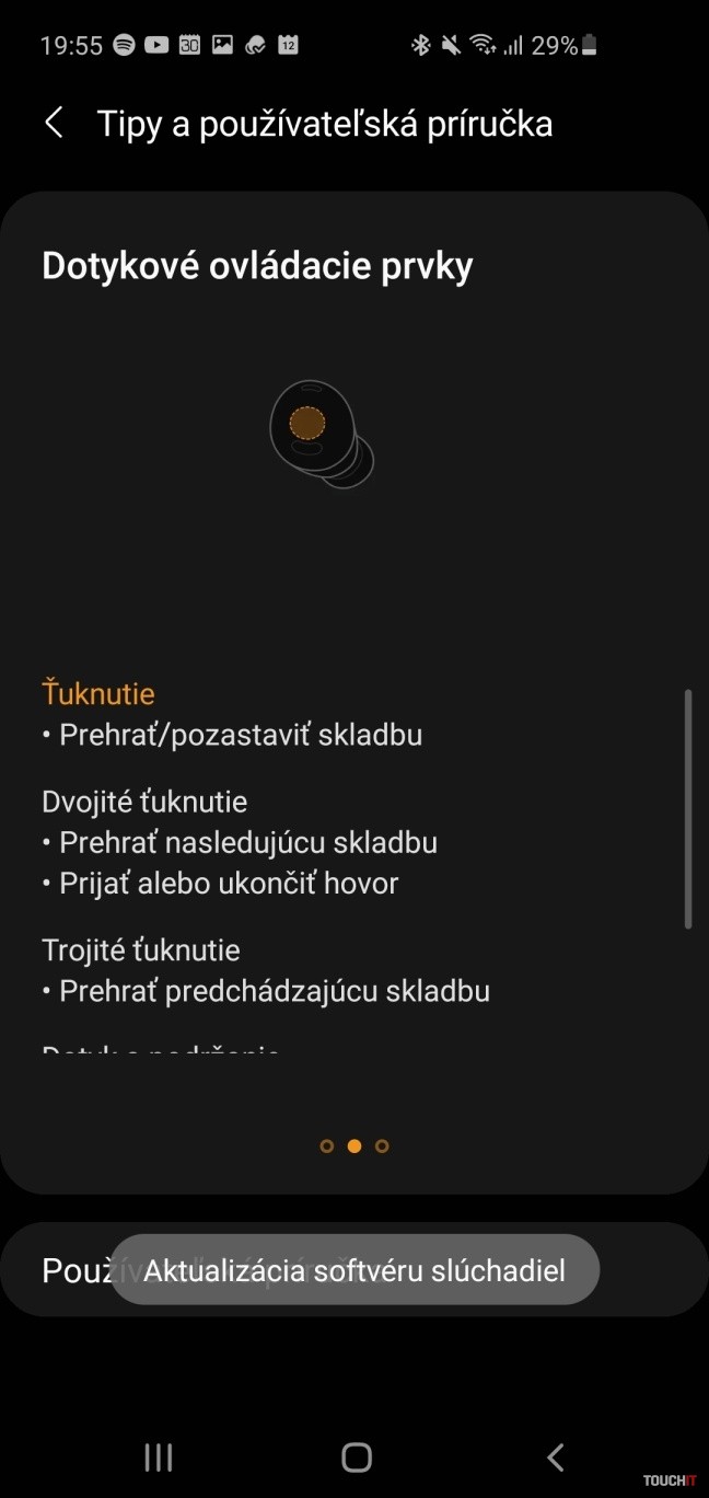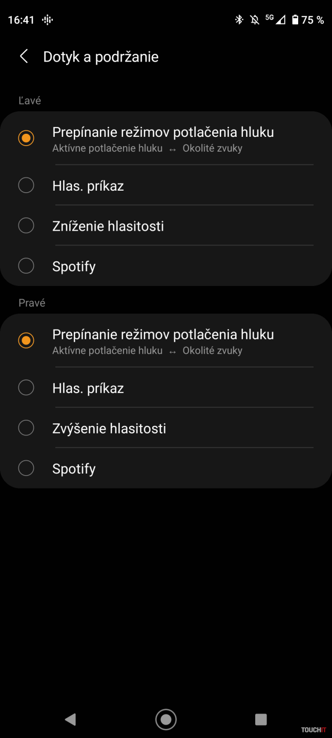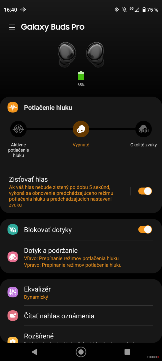 Medzi najlepšiefunkcie,ktoré oceňujem, je vypnutie dotykových plôch na slúchadlách. Podľa potreby si ich aktivujem alebo vypínam. Hudbu ovládam najradšej cez mobil, podobne aj hovory. Dotykové ovládanie je dobre navrhnuté a v nastaveniach softvéru Galaxy Wearable sa dá nastaviť, ako sa budú dotykové plochy správať.