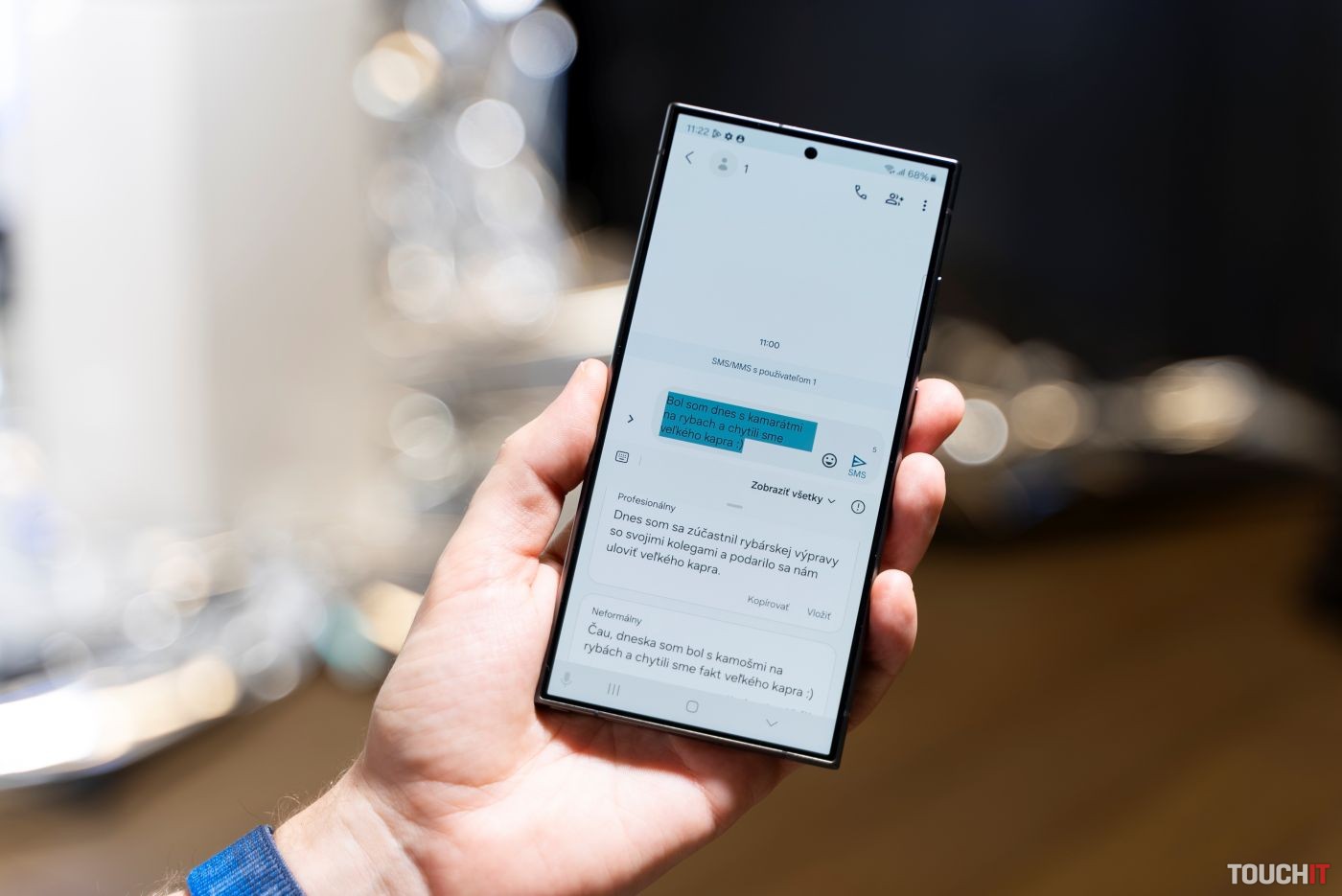 Existuje aj opačná funkcia – textový asistent. Píšete na Samsung klávesnici a umelá inteligencia prekladá túto informáciu do zvoleného jazyka v hlasovej podobe. Pritom si môžete vybrať konkrétny tón hovoreného slova – napr. profesionálny, neformálny, spoločenský, zdvorilý či dokonca preklad do vyjadrenia pomocou emotikonov. Podmienkou je, že text píšete na Samsung klávesnici.