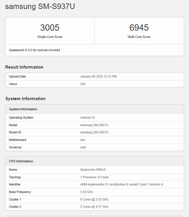 Prototyp Galaxy S25 Slim, s kódovým označením SM-S937U (model pre USA), bol testovaný v Geekbench s čipovou sadou Snapdragon 8 Elite, 12 GB RAM a Androidom 15 s One UI 7. Na výsledkoch by nebolo nič zvláštne, pokiaľ by test prebehol pred rokom. Galaxy S25 Slim totižto v single-core teste dosiahol skóre 3005 bodov a multi-core teste skóre 6945 bodov.