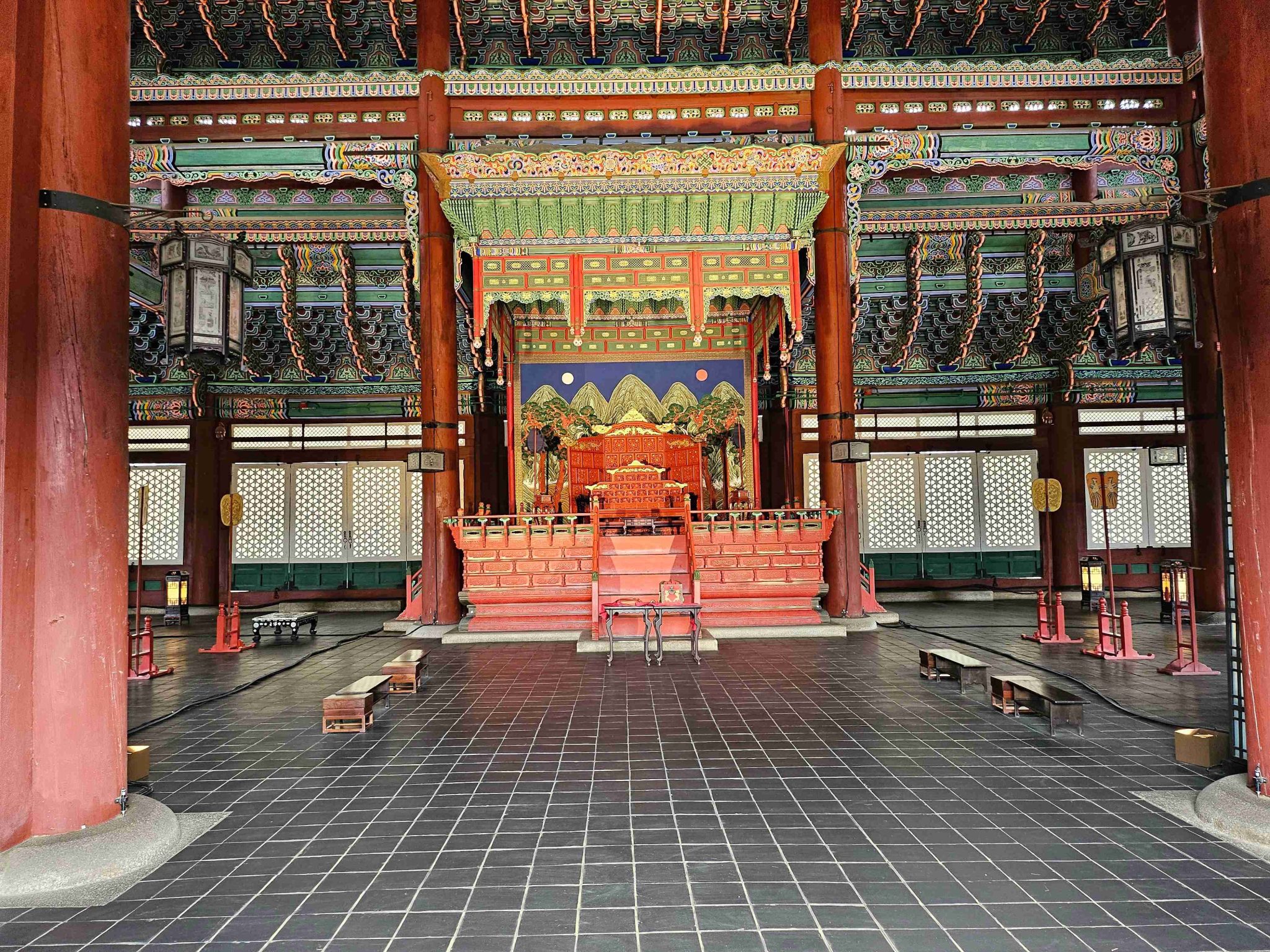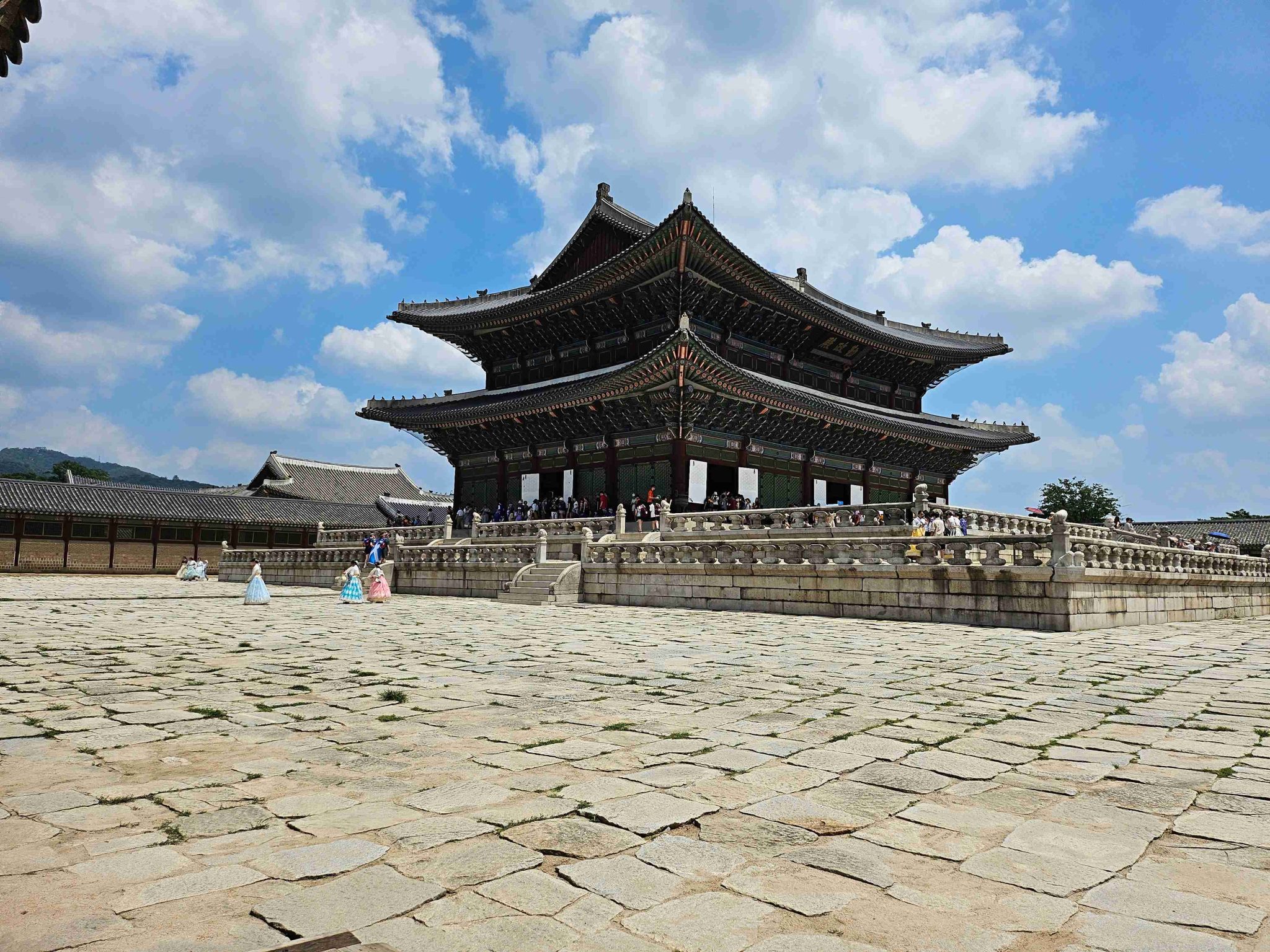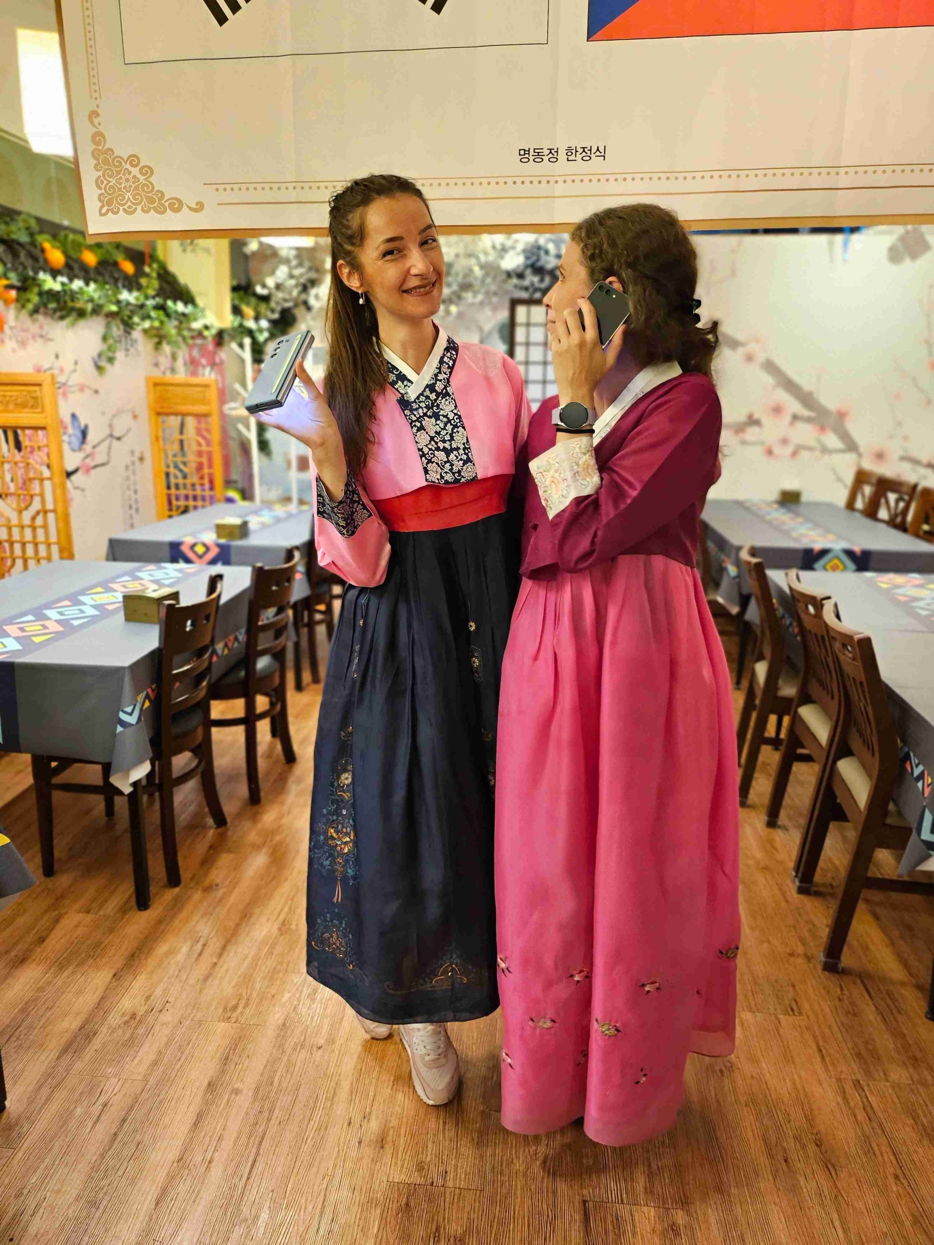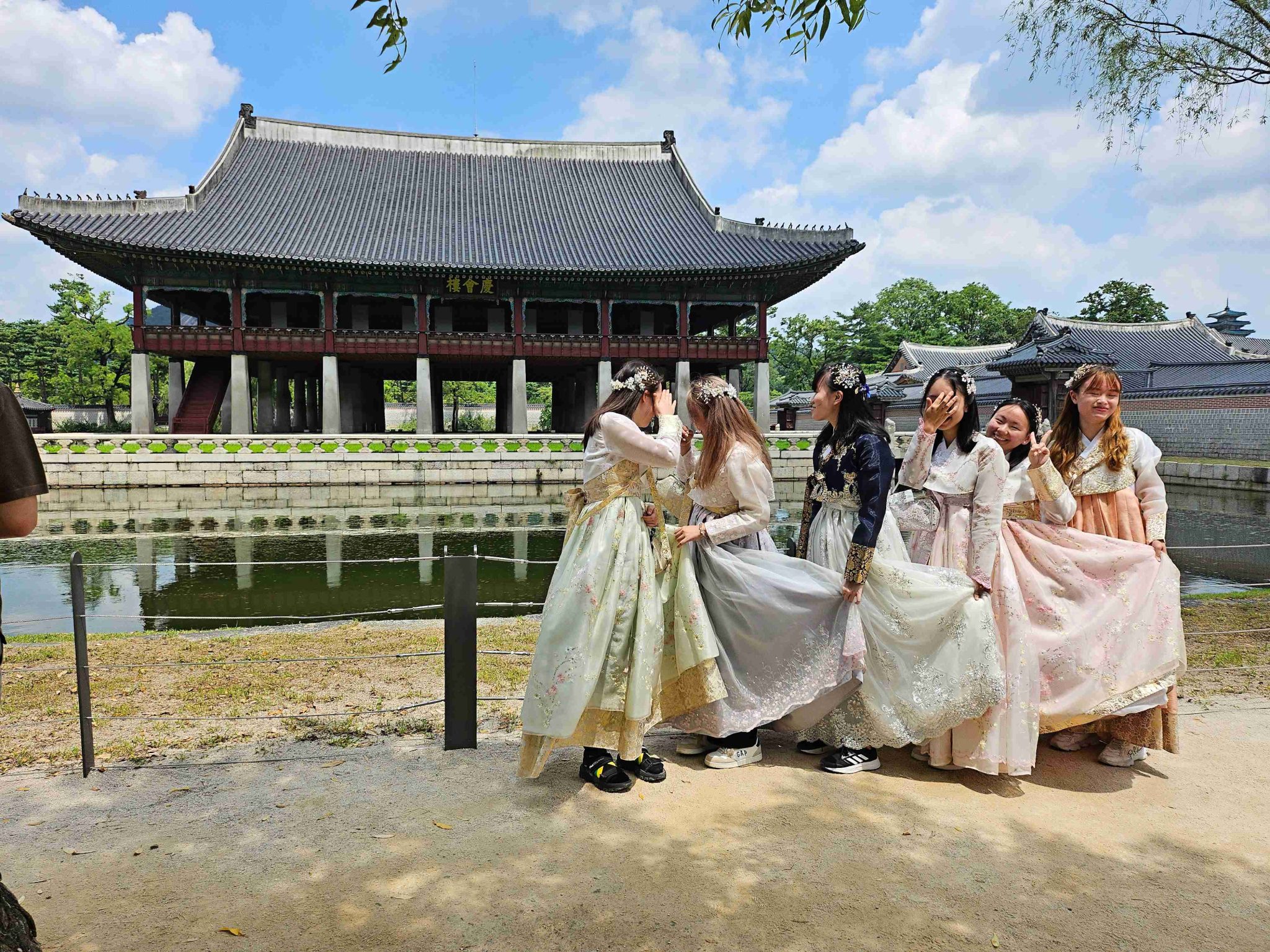 Pokračujeme testom fotenia kórejskej architektúry. Do jedného záberu sa nám ale zatúlali aj dievčatá v domácom kroji 🙂