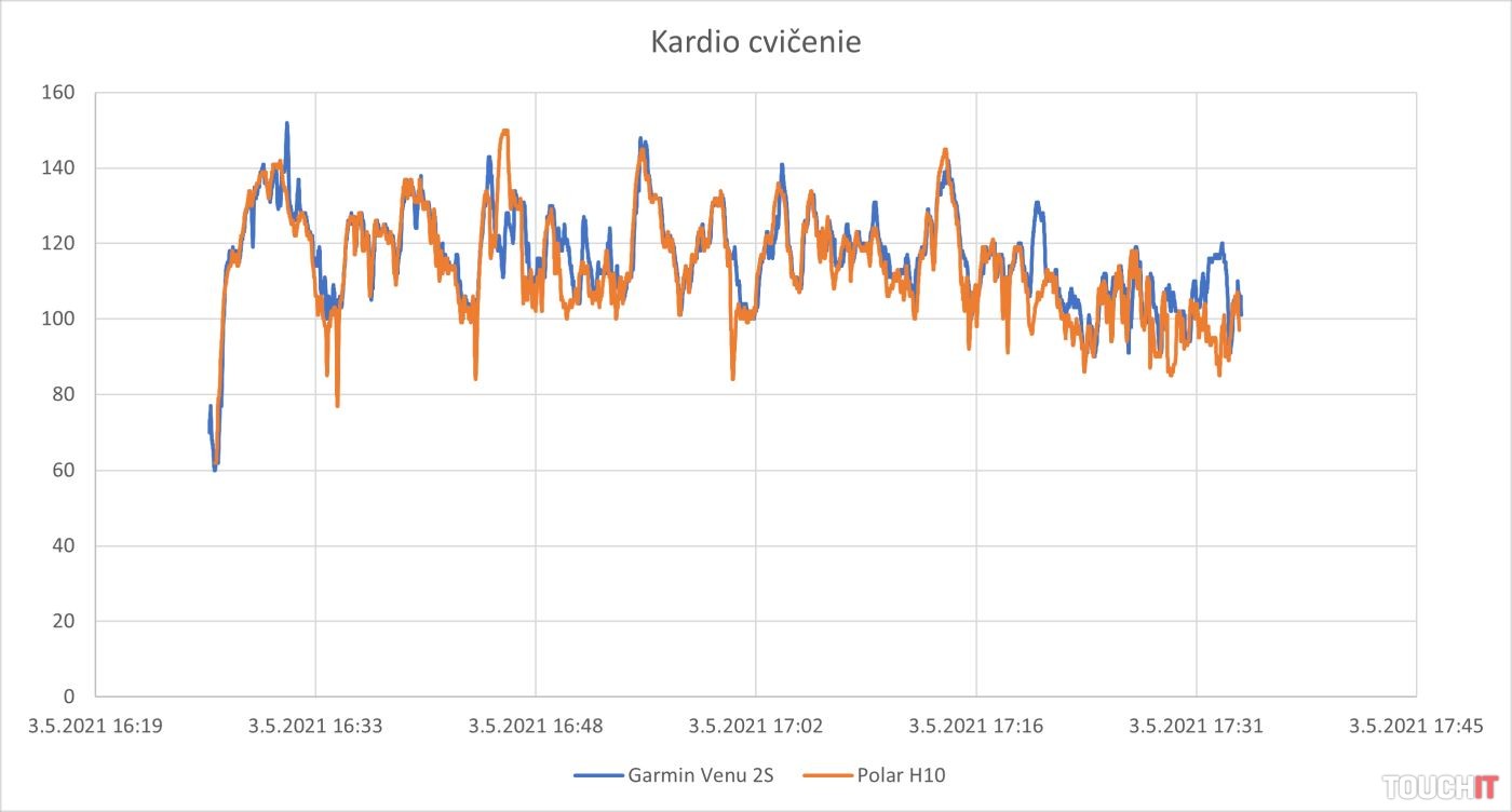 Kardio cvičenia a posilňovanie sú vo všeobecnosti veľkou výzvou pre inteligentné hodinky. Ani Venu 2S si neporadili s náhlymi zmenami tepu tak rýchlo ako hrudný pás, avšak namerané hodnoty boli presnejšie v porovnaní s mojimi Huawei Watch GT 2 Pro, ktoré používam dlhodobo a väčšinu času dobre kopírovali dáta z hrudného pásu.