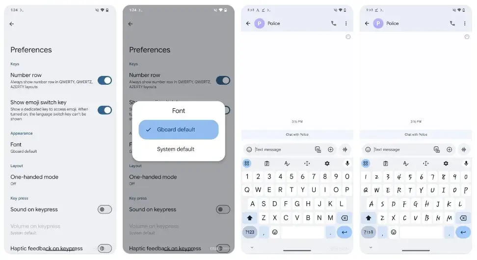 Hoci táto napohľad strohá ponuka nedáva na výber z príliš veľa možností, tak zmena písma na iné bude samozrejme stále možná v nastaveniach telefónu, po čom sa zmení aj v klávesnici Gboard. Stane sa tak v prípade, že máte povolené sledovanie nastavení systému a vyberiete nové systémové písmo. Škoda len, že Android stále nepodporuje natívne prepínanie medzi rôznymi štýlmi písma pre celý operačný systém.