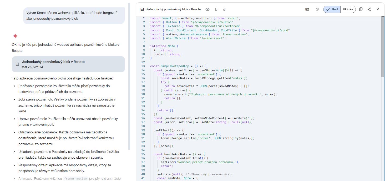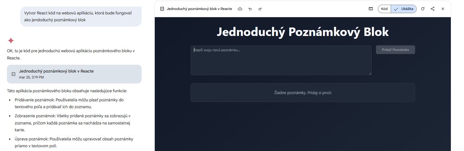Neznamená to, že všetko bude bez chýb, ale, že otázku a doplňujúci postup k implementácii kódu bude vľavo, vpravo potom samostatný kód, ktorý stačí len skopírovať. Vynikajúce a neskutočne prehľadné. Toto sa Googlu podarilo. Canvas má svoje tlačidlo, podobne ako funkcia Deep Research a treba ho aktivovať pred zadaním požiadavky.