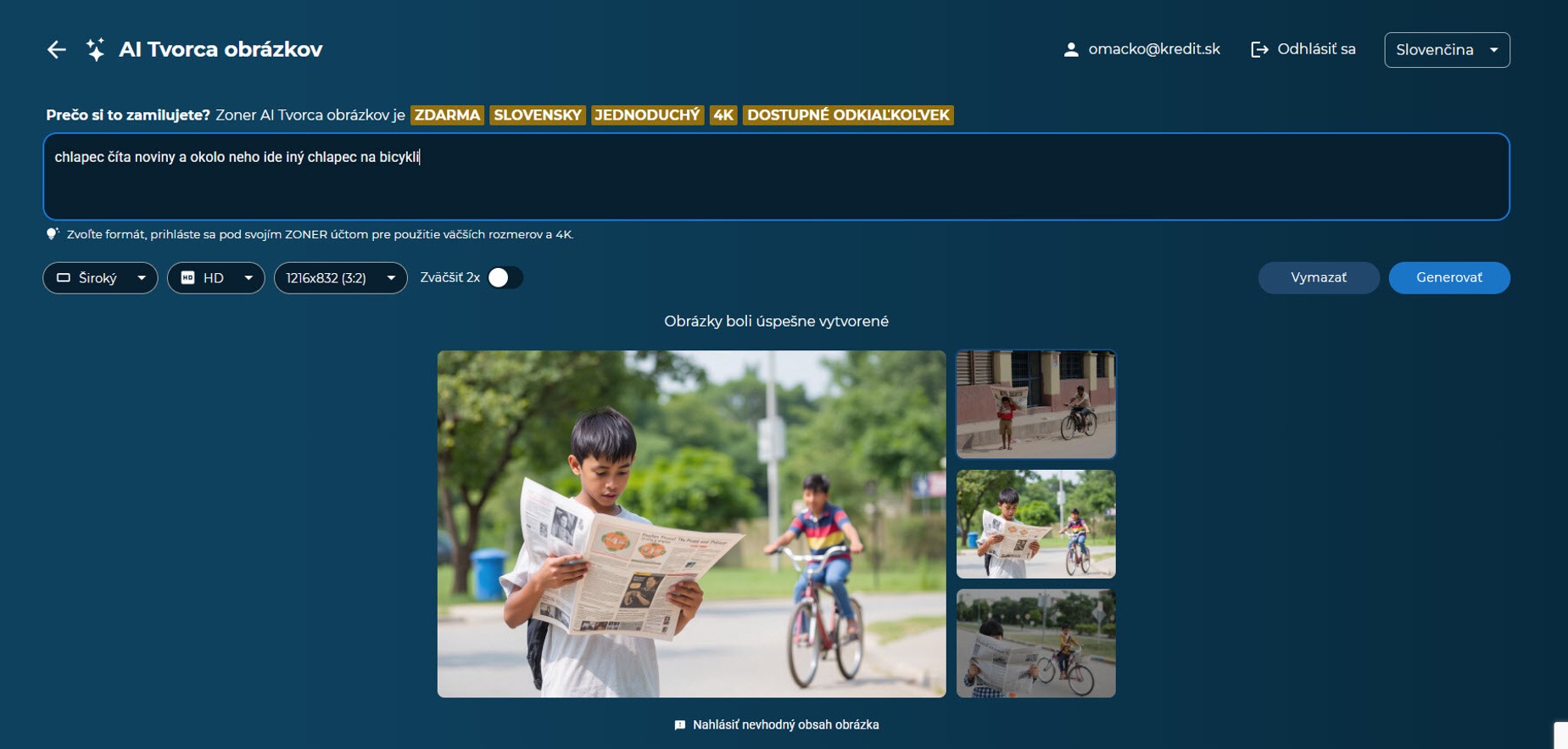 Je fakt rýchly, na vygenerovanie obrázkov počítajte so sekundami a je to rýchlejšie ako u konkurencie. Môže to byť dané aj tým, že Zoner prevádzkuje túto službu na vlastnom hardvéri a má k dispozícii viac ako 100 GPU AI. Dobrá správa pre Slovákov – je zadarmo a dokonca funguje aj bez inak neobľúbeného prihlásenia.