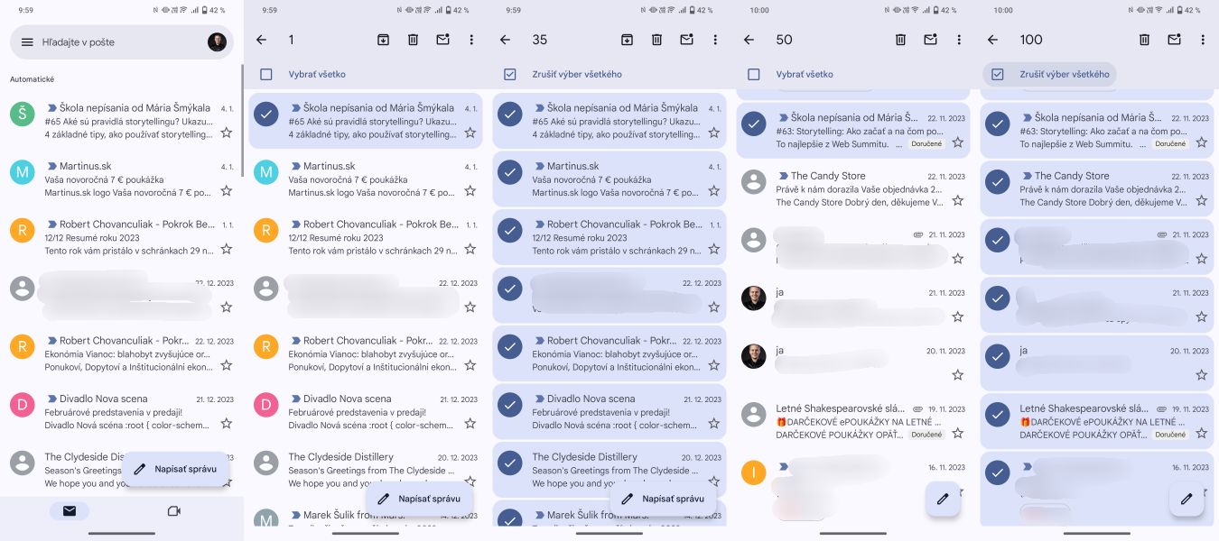 Treba upozorniť na to, že Gmail pre Android načíta maximálne 50 správ. Pokiaľ máte v schránke viac ako 50 emailov, označí sa prvých 50. Ak chcete označiť aj zvyšné, je potrebné scrollovať dolu. Gmail v rámci tohto procesu načíta ďalších 50 emailov a umožní vám opäť ťuknúť na tlačidlo Vybrať všetko – následne sa označí všetkých 100 načítaných správ. Takýmto spôsobom môžete pokračovať aj ďalej.
