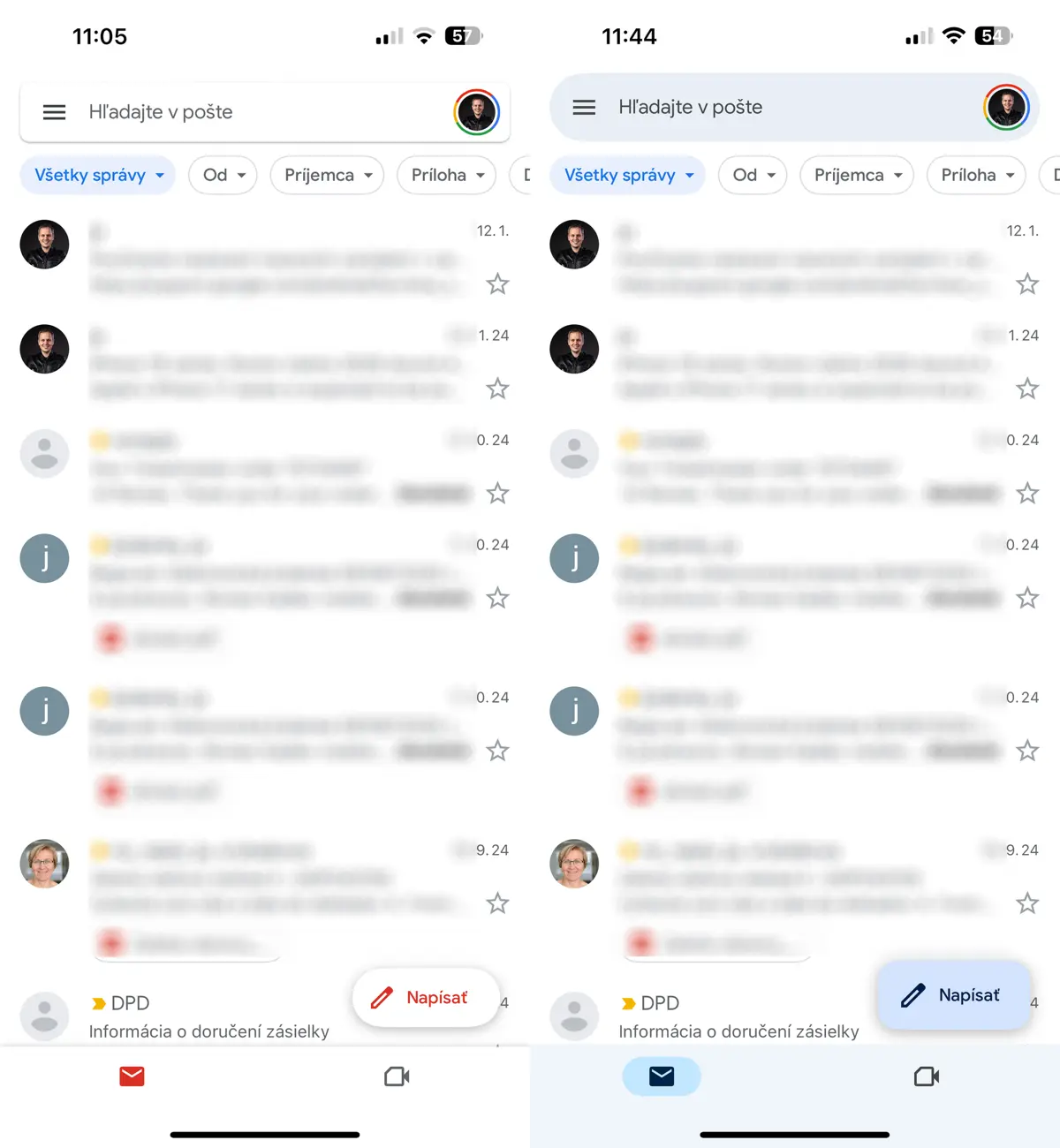 Material 3 dizajn prináša pár drobných zmien, ktoré by ste si možnože ani nevšimli, ak by som vás na ne neupozornil. Prvou zmenou je mierne zmenená ikona Napísať v pravom spodnom rohu, ktorá má v novej verzii trochu iný tvar a najmä modré pozadie.