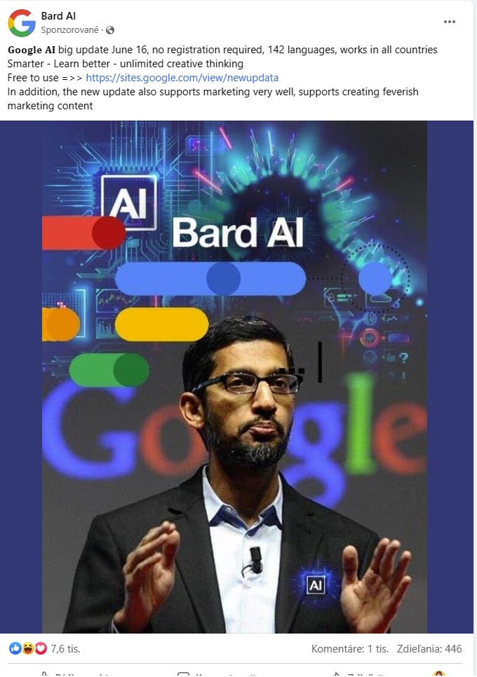 Takýchto príspevkov môže byť viac a my sme na naň narazili vo vlastnom zozname výberu správ v tejto sociálnej sieti. Príspevok označený ako Bard AI, je dokonca sponzorovaný. To vytvára falošný obraz o tom, že ide o legitímny príspevok. Čomu sa konkrétne venuje?