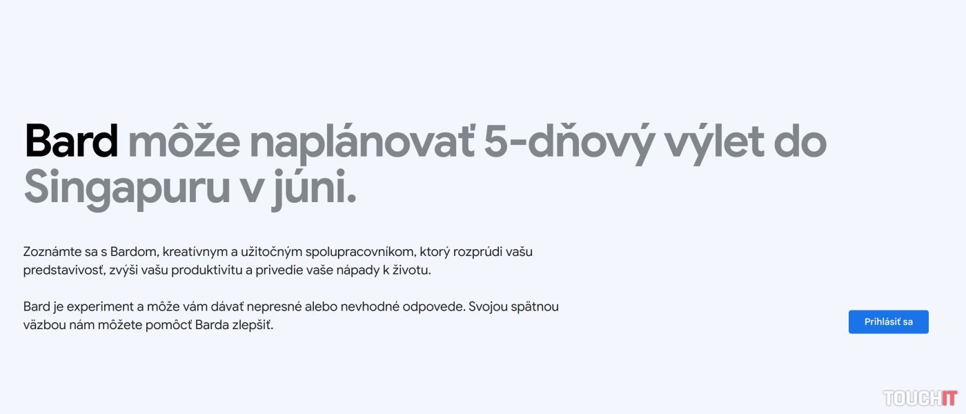 Barda nájdete na stránke Bard.google.com, rozhranie je, samozrejme, v slovenčine. Na úvodnej obrazovke vám služba predstaví niektoré možnosti a spôsoby komunikácie a upozorní, že zatiaľ ide o experimentálnu službu a môže dávať nepresné alebo nevhodné odpovede.
