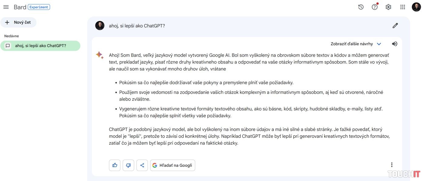 Samotné rozhranie v zásade ničím neprekvapí a podobá sa na ChatGPT či BingAI. Bohužiaľ, rovnako ako tieto dve služby občas poskytne nepresné, alebo fakticky nesprávne informácie, čo sme si vyskúšali, keď sme sa ho pýtali na niektoré slovenské osobnosti.