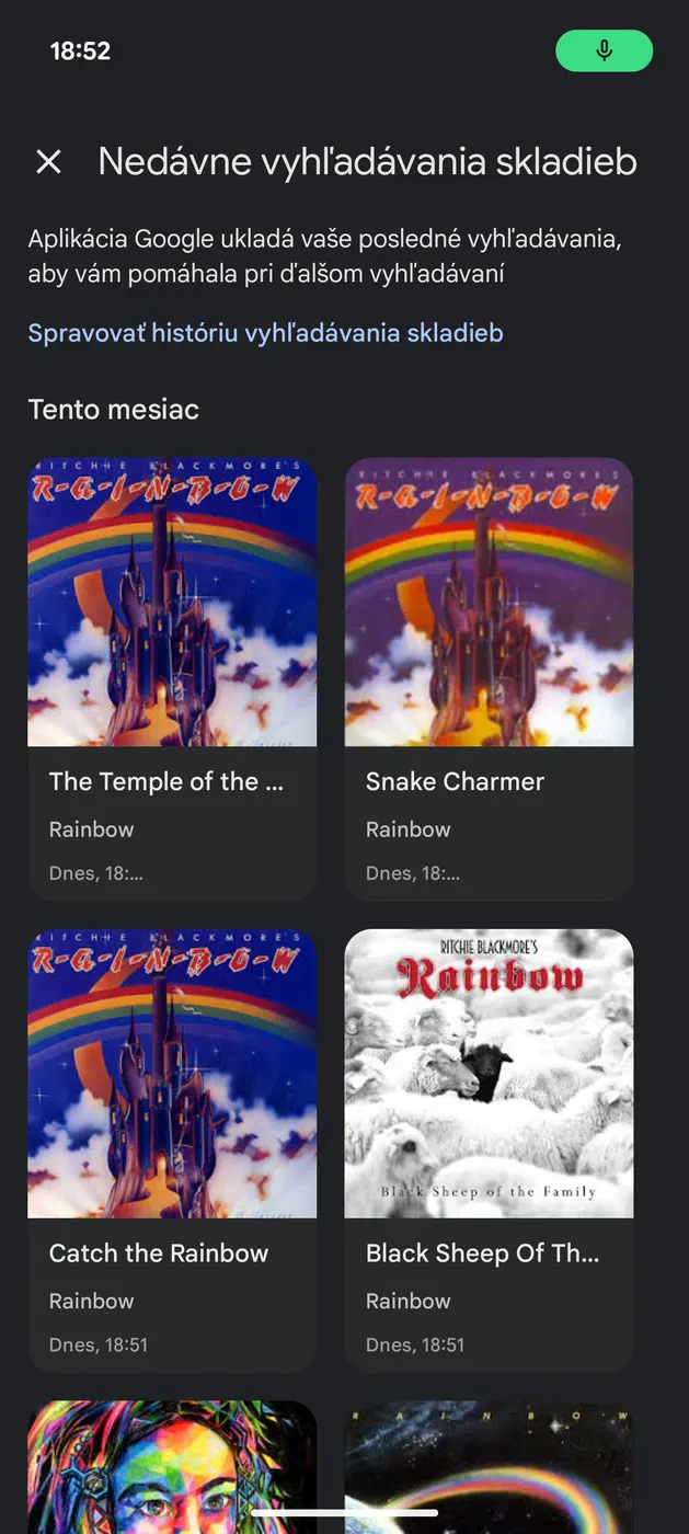 Keď budete počuť zaujímavú neznámu pesničku, stačí kliknúť na ikonu s notou v aktívnej lište Circle to Search. Po novom uvidíte v pravom hornom rohu aj ikonku hodín, ktorá vás prepne na stránku s prehľadom posledných skladieb, ktoré ste v minulosti vyhľadávali. Každá skladba je zobrazená s názvom, interpretom, dátumom a obalom albumu. Kliknutím na skladbu sa zobrazia jej výsledky vo vyhľadávaní Google.