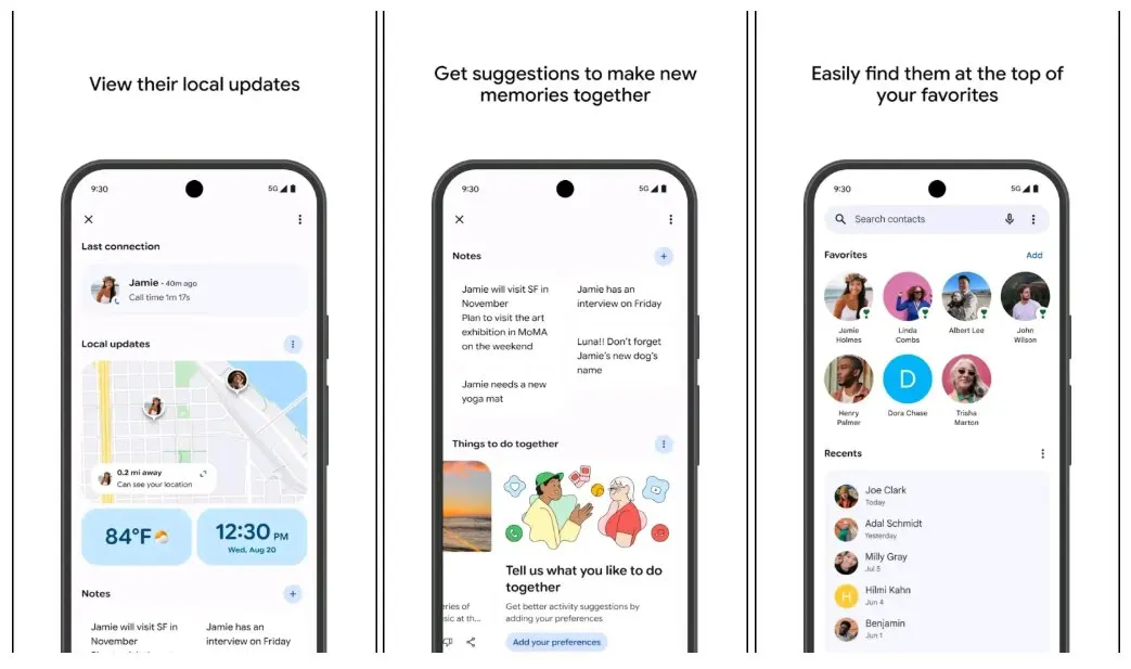 Na základe uniknutých snímok obrazovky sa zdá, že nová funkcia bude prehľadne zobrazovať celoobrazovkový kanál s profilovým obrázkom a možnosťami rôznych typov kontaktovania – volanie, správa, WhatsApp. Zobrazovať sa budú aj blížiace sa narodeniny, posledný hovor alebo správa, a sekcia s polohou, počasím a časom. Bude tiež možné zapisovať poznámky v štýle Google Keep a zobrazovať aj návrhy na spoločné aktivity.