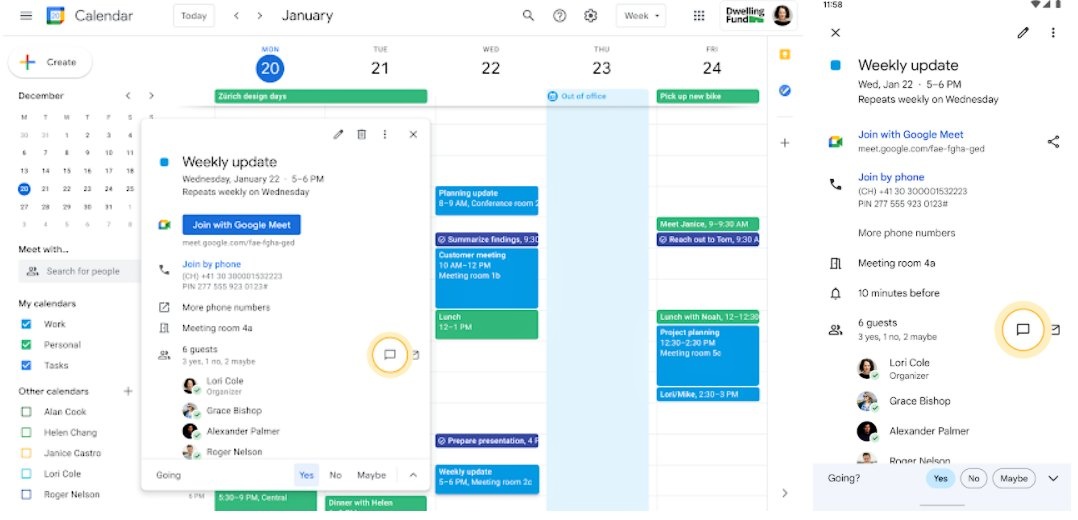 Aktuálne aj aplikácia Kalendár získava integráciu služby na posielanie správ – tentokrát Google Chat. V prostredí Kalendára sa odteraz nachádza nové samostatné tlačidlo Chat. Po kliknutí na toto tlačidlo sa vytvorí skupinový chat so všetkými účastníkmi udalosti. Spojenie aplikácií Chat a Kalendár prináša nové možnosti na zvýšenie produktivity.