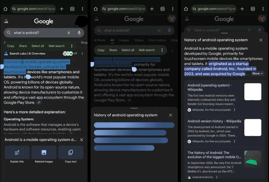 Okrem vysvetlenia alebo rozšírenia textu bude možné vyhľadať obrázky, ktoré sa týkajú vybraného textu. Ak však potrebujete, stačí vybraný text skopírovať a použiť ho obvyklým spôsobom. V praxi to znamená, že ak vás niečo v AI Prehľadoch zaujme, bude možné sa jednoducho dostať k podrobnejším informáciám a vizuálom bez nutnosti zadávať nový dopyt.