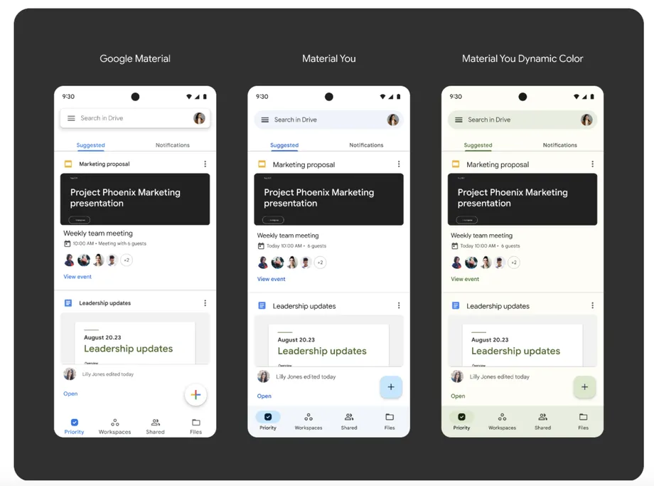 Jedna z hlavných dizajnových zmien bude zladenie farieb aplikácií so systémom Android 12 a toto pravdepodobne uvidíme najprv na zariadeniach Pixel. V prvej fáze to budú aplikácie Gmail, Google Meet a Disk Google. Google túto zmenu nazýva ako „dynamickejší, personalizovanejší vzhľad“. Existujúce farebné schémy a farebne odlíšené typy súborov a priečinkov v aplikáciách zostanú nezmenené.