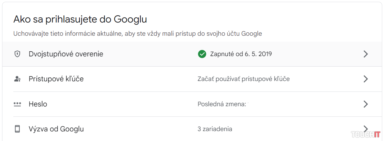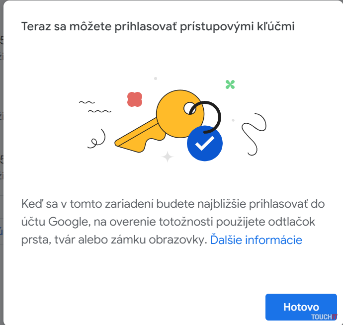 Úvodné nastavenie bude možno pôsobiť trochu zmätočne, pretože automaticky vygenerované prístupové kľúče sa v nastaveniach účtu zobrazujú, no bude ich treba ešte aktivovať. Proces úvodného nastavenia je v tejto fáze dokončený a na to, aby ste ho úspešne použili, je potrebné sa pokúsiť práve cez službu prístupových kľúčov prihlásiť do vášho účtu. Ideálne je, ak sa z účtu odhlásite, alebo použijete súkromný režim prehliadača či iný prehliadač, kde ešte nie ste, do Google služieb prihlásený.