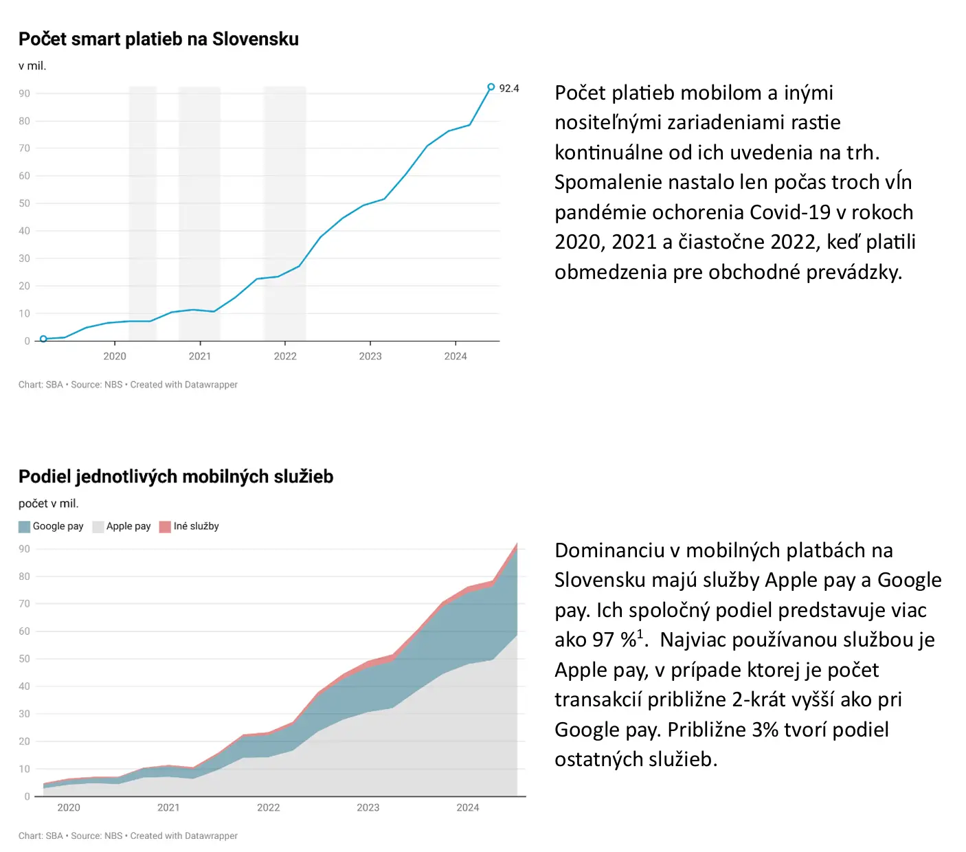 Používatelia využívajú smart platby nielen v obchodoch (87 % platieb), ale aj pri internetových nákupoch. Túto funkciu ponúkajú iba Apple Pay a Google Pay, takže nikoho asi neprekvapí, že práve tieto dve služby majú absolútnu dominanciu na Slovensku. V prvom polroku 2024 boli zodpovedné za 97 % všetkých smart platieb. Zvyšné 3 % si rozdelili ostatné platobné služby.