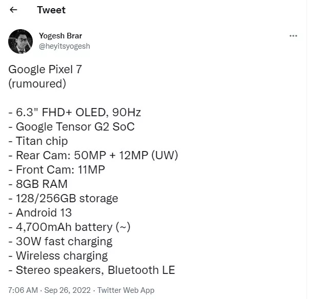 Telefóny Pixel patria medzi špičku mobilnej fotografie, čiže sa očakáva, že Pixel 7 a 7 Pro opäť potvrdia tieto kvality. Pixel 7 do svojej výbavy dostane hlavný 50 Mpx fotoaparát a 12 Mpx ultraširokouhlý fotoaparát. Telefón má údajne dostať aj 11 Mpx selfie fotoaparát. Vo výbave by nemal chýbať Android 13, stereo reproduktory, Bluetooth LE a podpora čipu Titan.