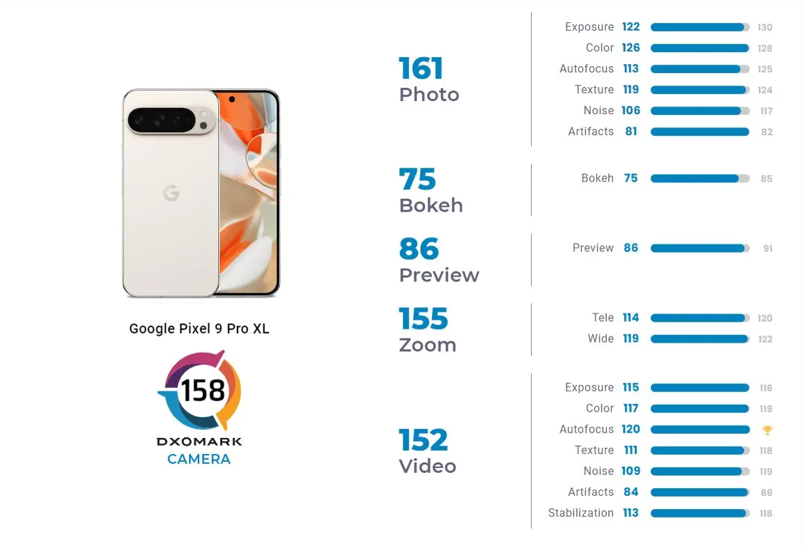 Zostava s fotoaparátmi pri Pixel 9 Pro XL pôsobí skutočné mohutným dojmom, pričom obsahuje 50 Mpx hlavný fotoaparát (25 mm), 48 Mpx ultraširokouhlý fotoaparát a 48 Mpx fotoaparát s periskopickým teleobjektívom. Selfie fotoaparát má 42 Mpx a podporu PDAF. Pixel 9 Pro XL v testoch DxOMark dosiahol skóre 158 bodov, čím dorovnal Honor Magic6 Pro. Jediným telefónom, ktorý teda nový TOP model od Google prekonal, je Huawei Pura 70 Ultra, ktorý získal 163 bodov.