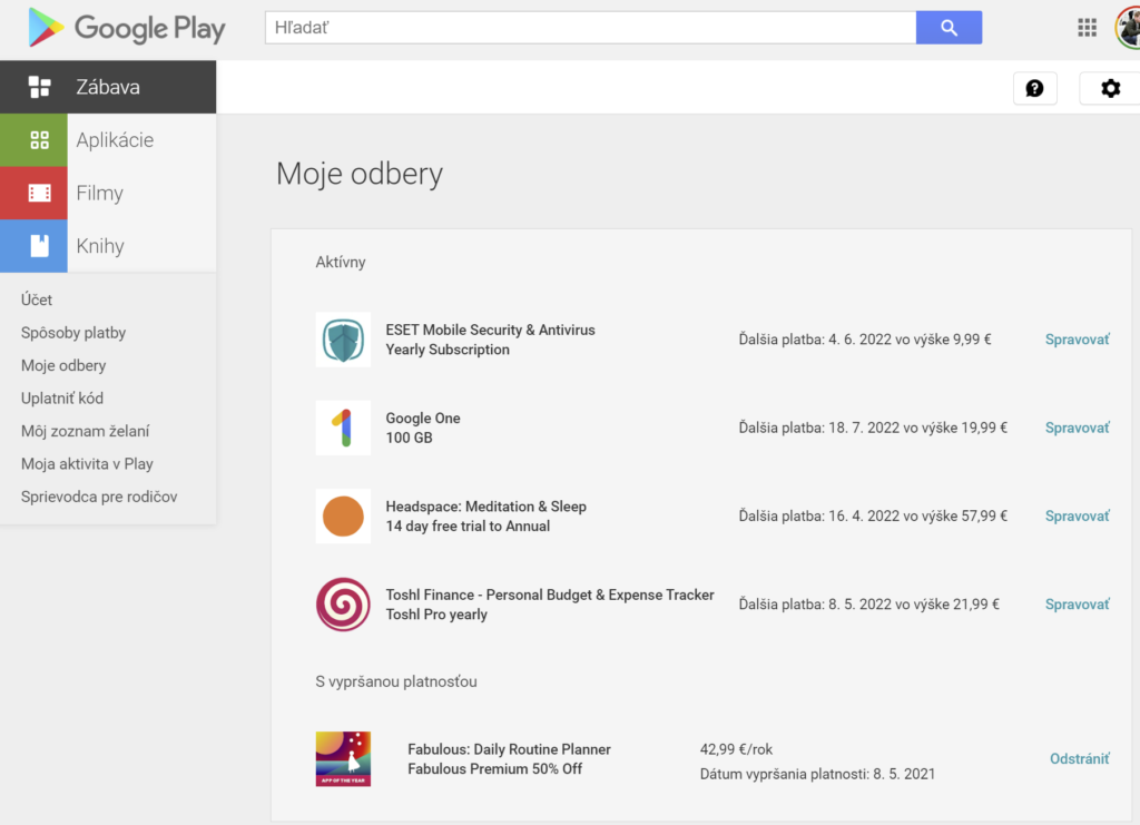 Skontrolovať svoj odbery môžete na tejto stránke a zistíte, ktoré aplikácie vôbec pravidelne platíte cez Google Play a kedy začína ďalšie obdobie na zaplatenie. V zozname položiek je uvedený oficiálny názov položky či aplikácie, kedy bude ďalšia platba a v akej výške. Kliknite na Spravovať a môžete aktualizovať platobnú kartu alebo napríklad Zrušiť odber.