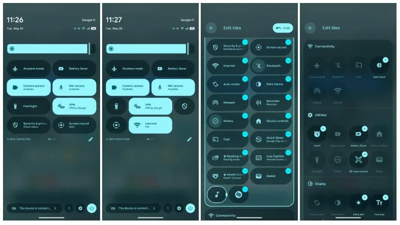 Najvýraznejšou zmenou prešli Rýchle nastavenia. Tie dostali nové usporiadanie s možnosťou zmeny veľkosti dlaždíc, nové rozdelenie do kategórií a rozmazané pozadie.