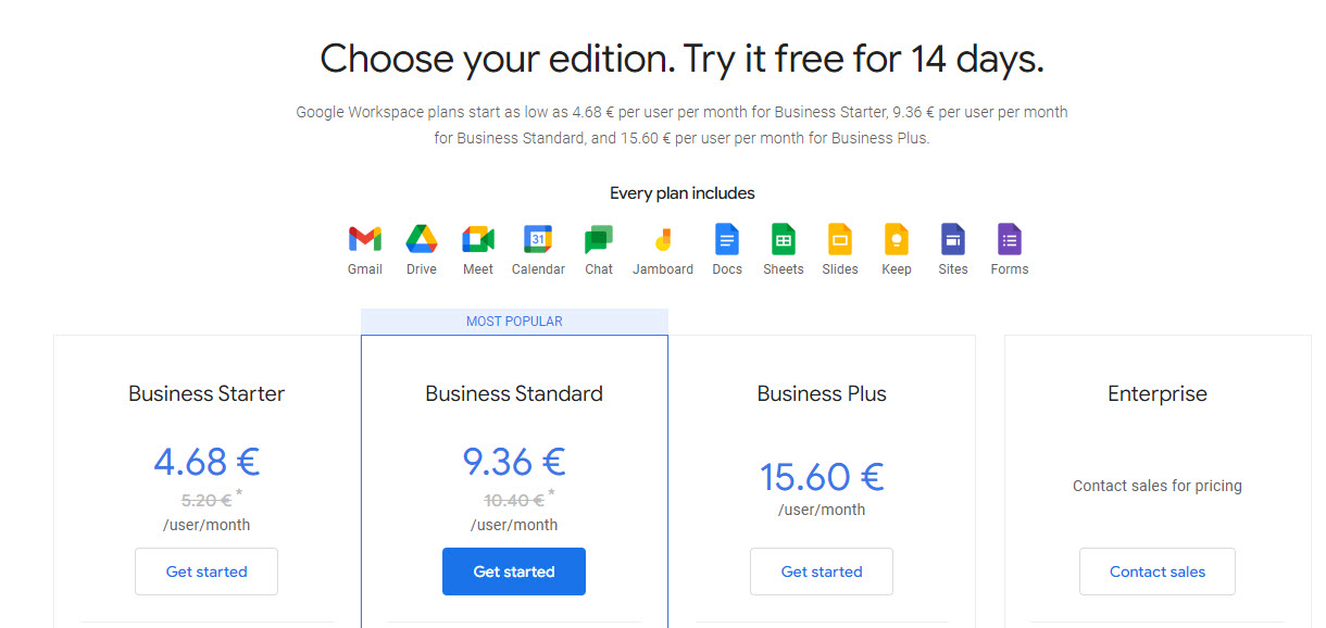 Podľa Google najpopulárnejší je plán Business Standard, ktorý umožňuje 150 účastníkov na videomítingu + jeho záznam a 2 TB cloudového priestoru na používateľa. Za tento plán zaplatíte 9,36 eur mesačne za používateľa.
