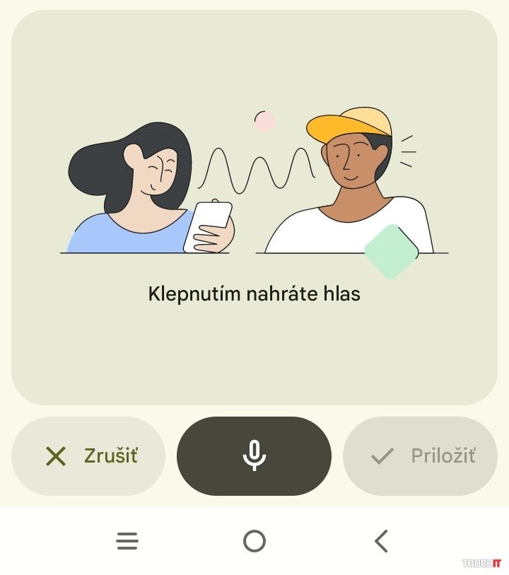 Na nahrávanie treba ťuknúť na ikonu zvukových vĺn vpravo. Zobrazí sa panel, ako je vidieť na obrázku. Stlačením mikrofónu sa spustí nahrávanie. Tlačidlo netreba držať prstom, ako u WhatsAppu alebo ho pohybom zamknúť a nahrávať bez potreby držania prsta na tlačidle. Funkcia podporuje potlačenie okolitého šumu.