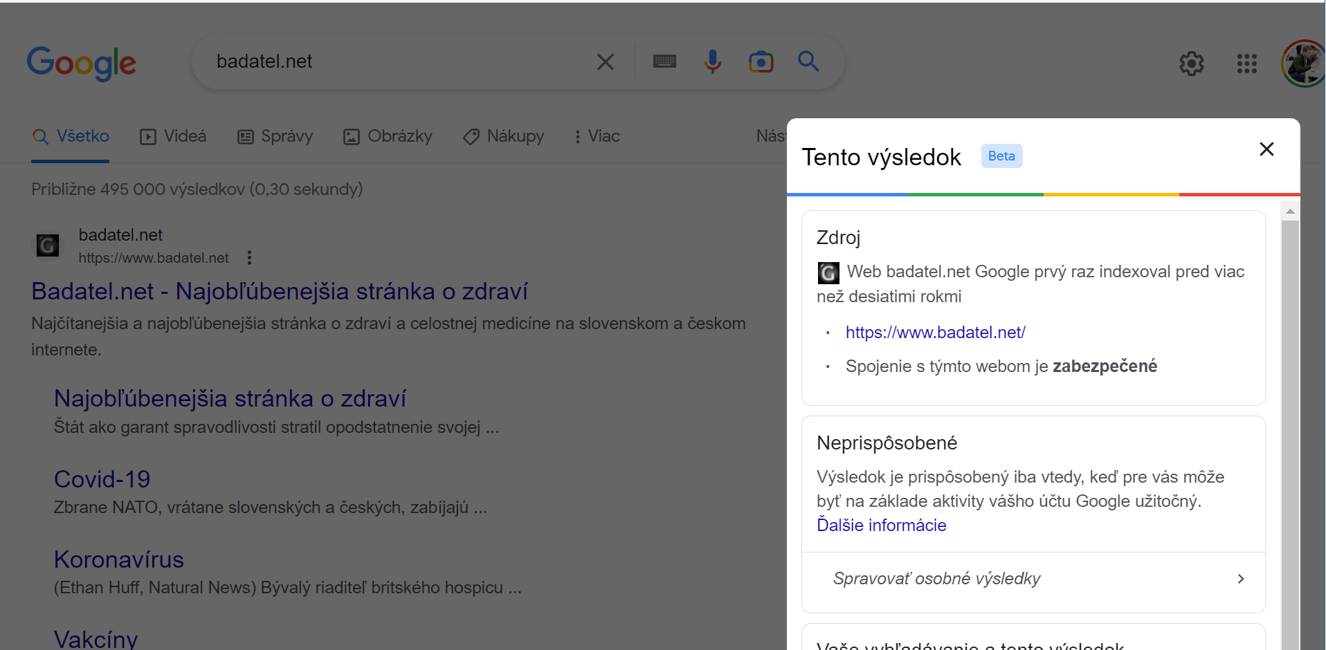 Výsledky vyhľadávania zobrazia pri jeho nadpise tri zvislé bodky. Tie po kliknutí zobrazia plávajúci panel s ďalšími informáciami. Vyskúšali sme novo ohlásenú funkciu, no zatiaľ z nej máme zmiešané pocity. Ako je vidno na obrázku, o webe Badatel sme sa veľa nedozvedeli. Pritom ide o rizikový web z pohľadu obsahu článkov a na webe Konšpirátori je na 12. priečke z pohľadu rizikovosti nepravdivých informácií.