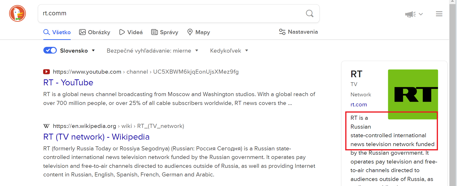 Všimnite si ale, že v prípade vyhľadávača DuckDuckGo pri vyhľadaní spojenia RT.comm sme dostali detailnejší popis, o akú stránku ide. Vyhľadávač správne poznamenal že ide o Ruskom kontrolovanú televíziu. Budeme dúfať, že informácií v tomto duchu bude pribúdať aj pre menej známe weby a rovnako aj na Googli, ktorý nám dal úplne iné výsledky hľadania a stránka ruského spravodajstva sa nám na prvej stránke vyhľadávania ani nezobrazila. Dokonca ani v režime Inkognito.