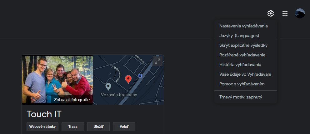 Na akejkoľvek štandardnej obrazovke Google vyhľadávania (aj na stránke Google vpravo dole) kliknite na ikonu Nastavenia vedľa obrázka používateľského profilu a následne na Nastavenia vyhľadávania. Na ľavej strane kliknite na položku Vzhľad. Môžete si vybrať medzi Predvoleným nastavením zariadenia alebo ručne vybrať Tmavý alebo Svetlý motív. Túto zmenu je potrebné potvrdiť tlačidlom Uložiť.