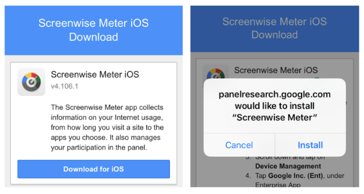 Tá slúžila na zhromažďovanie používateľských údajov od používateľov, mladších ako trinásť rokov. Podobne, ako v prípade aplikácie Facebook (Facebook Research), tak aj aplikácia spoločnosti Google (Screenwise Meter), používa certifikát spoločnosti Apple, ktorý je určený na distribúciu aplikácií určených pre zamestnancov. Týmto spôsobom sa má obísť App Store a získať prístup k bohatej zásobe používateľských údajov.Po stiahnutí aplikácie, používatelia dokončia prieskum a následne je im zaslaný špeciálny kód, ktorý im umožní prevziať VPN aplikáciu, založenú na certifikáte Enterprise. Tá sa potom použije na monitorovanie všetkých aplikácií, ako aj využívania internetu. S cieľom prinútiť používateľov spolupracovať, Screenwise meter ponúka darčekové karty, výmenou za ich údaje.