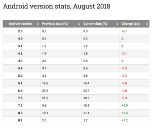 Je len 1. september a Google už stihol zverejniť augustový mesačný report globálnej distribúcie jednotlivých verzií Androidu. Vyplýva z neho dobre známy fakt, že pýšiť sa najaktuálnejšou verziou najrozšírenejšej mobilnej platformy na svete, môže iba minorita používateľov. Čerstvá novinka v podobe Androidu 9 Pie je aktuálne výhradne doménou smartfónov Google Pixel a Essential Phone, preto vzhľadom na zanedbateľné čísla v rebríčku vôbec nefiguruje. Na smartfóny ostatných výrobcov bude update distribuovaný len veľmi pomaly. Výnimkou sú Sony, Xiaomi, HMD Global, Oppo, Vivo, OnePlus a tiež pár smartfónov bežiacich na Androide One, ktorí prisľúbili uvoľnenie updatu, minimálne pre svoje top modely, najneskôr do konca tohto roka. Minuloročný Android 8 Oreo si v auguste polepšil o 2,5% a celkovo ho momentálne používa 14,6% zariadení. Prvú priečku aj naďalej okupuje Android 7 Nougat, ktorý aj vďaka augustovému rastu o 0,9% celosvetovo beží takmer na tretine (30,8%) androidových smartfónov či tabletov. Prvú trojku uzatvára Android 6 Marshmallow s celkovým počtom 22,7% aktívnych zariadení, čo znamená 0,8% pokles oproti júlovým výsledkom. Ako sú na tom zvyšné verziu Androidu? Odpoveď sa dozviete v tabuľke, respektíve grafe nižšie:
