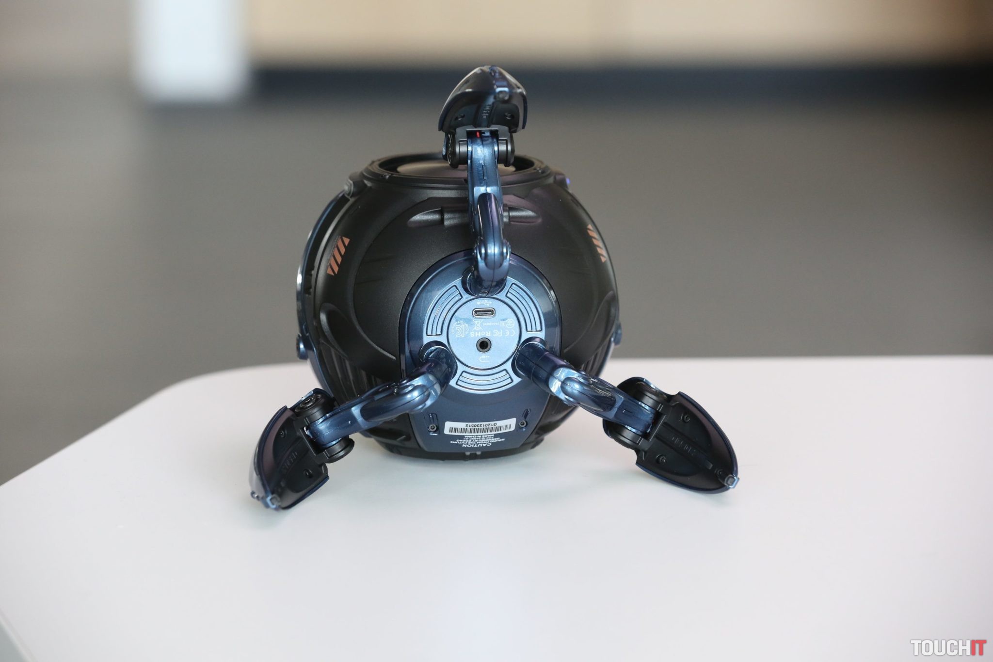 Na fotografiách vo verzii Sci-fi Blue s rozkladacími nohami. Môžete si ho postaviť do zloženej pozície alebo mu nohy vystrieť a tak ho vyvýšiť. Toto by mala byť jeho základná poloha, najmä ak ho budete chcieť nabíjať alebo k nemu pripájať zvukový vstup cez audio kábel a 3,5 mm konektor. Jeho „postavenie na nohy“ zároveň zlepšuje stabilitu celého reproduktora a gumové podložky ho držia stabilne na mieste aj na nerovnom povrchu. Káble vedú zospodu a je to dobre vymyslené riešenie. Z boku by to kazilo celkový vzhľad a vzadu je basový menič. Reproduktor má teda samostatný výškový a samostatný basový menič, ktoré vytvárajú vhodnú zvukovú kombináciu s výkonom až 20 W. Nie je to vyslovene dunivé, no je to rozhodne dobrý doplnok a získate lepší zvuk ako z jedného širokospektrálneho meniča.