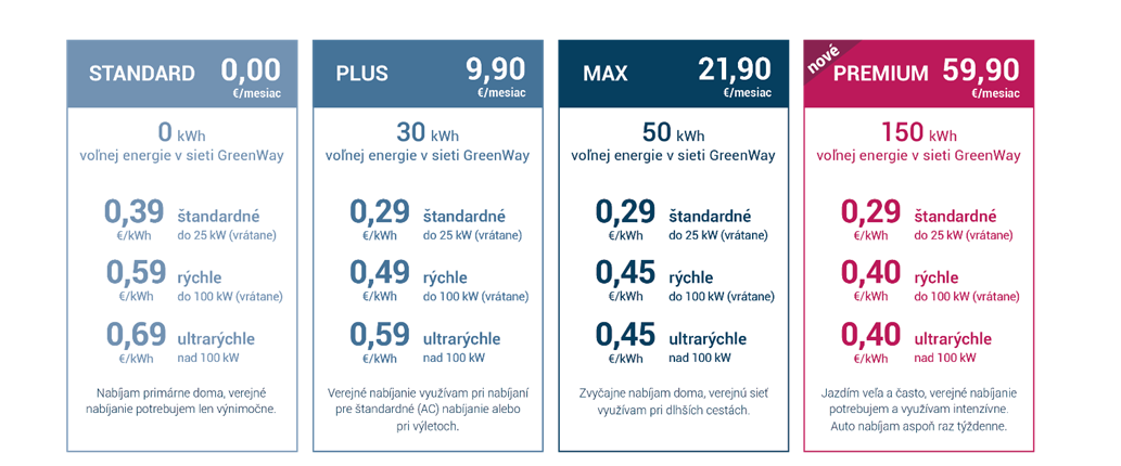 Od 1. októbra 2024 preto pristúpi k úpravám cenníka, v ktorom pribudne mesačný program GreenWay Energia Premium určený pre vodičov elektromobilov s veľkým nájazdom a potrebou často sa nabíjať vo verejnej sieti. Obsahuje 150 kWh predplatenej energie a prístup k výhodným cenám nabíjania po prečerpaní paušálu – 0,29 € / kWh na bežných a 0,40 € / kWh na všetkých rýchlonabíjačkách. Mesačný poplatok bude 59,90 € vrátane DPH. Tento program bude výhodnejší pre tých, ktorí čerpajú viac energie, ako doteraz ponúkal program Energia Max.