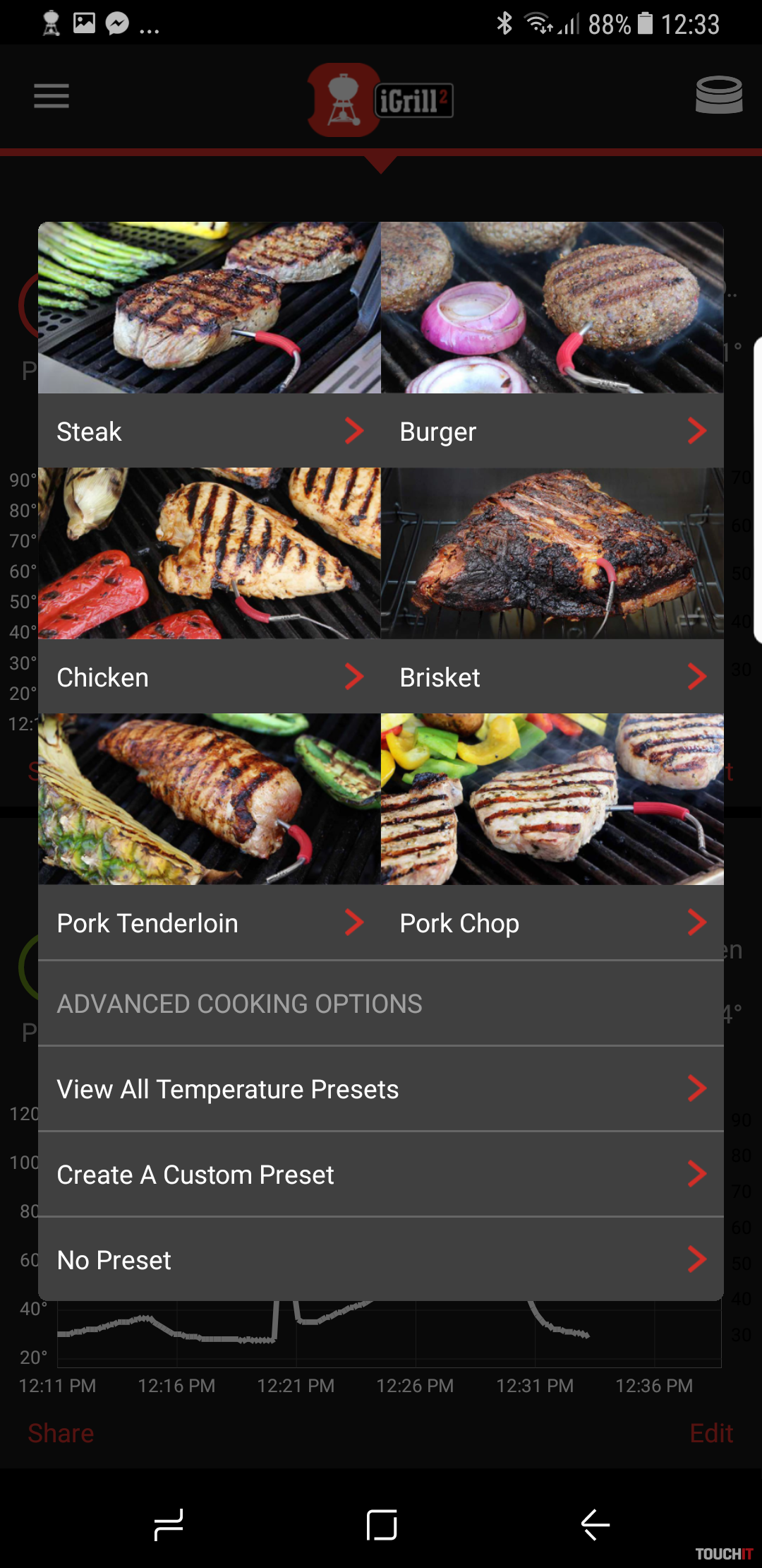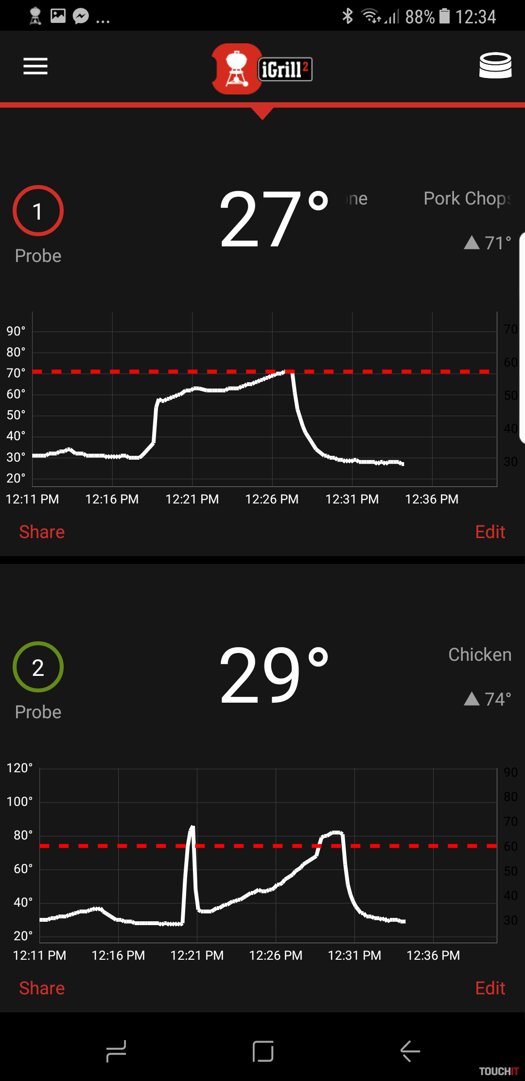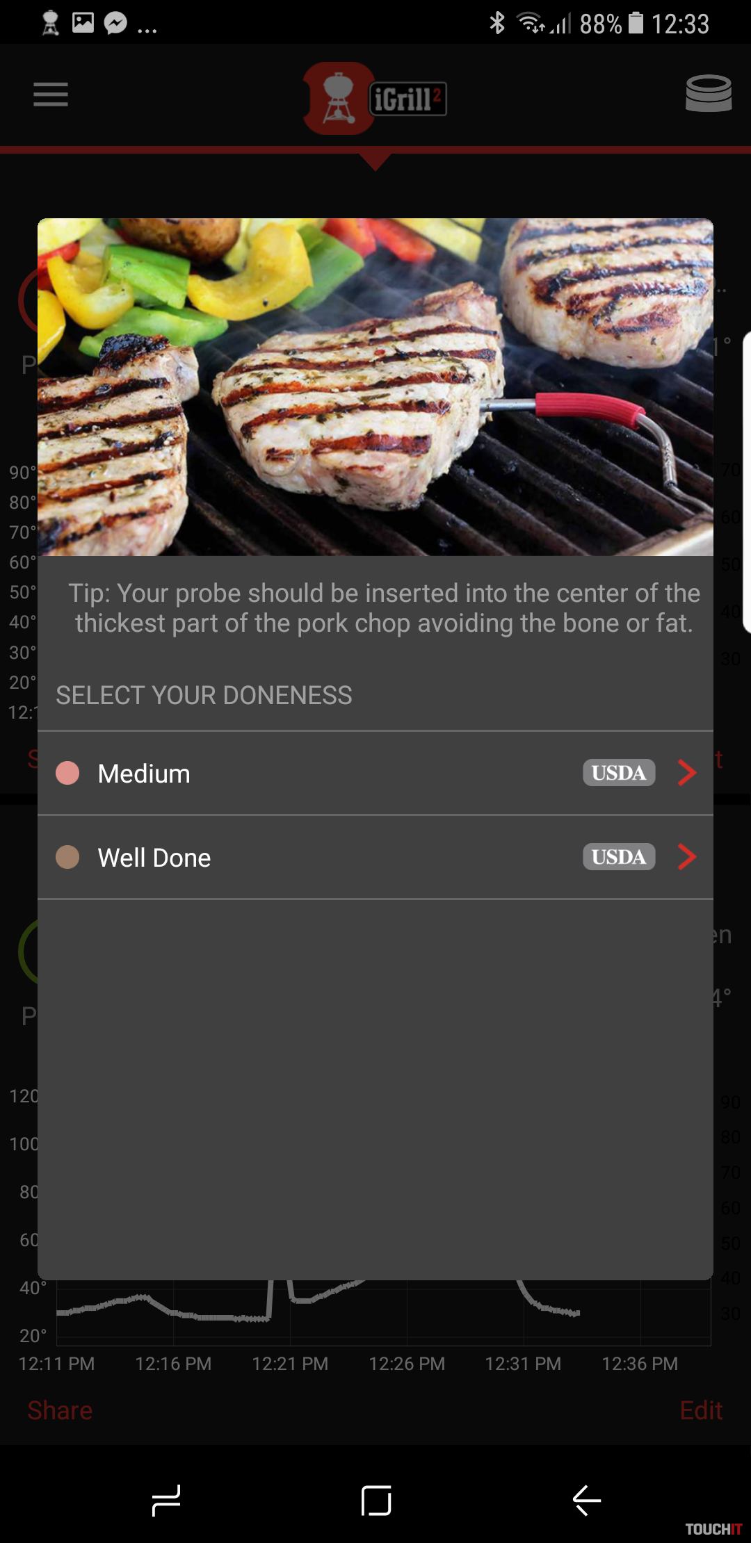 iGrill existuje vo viacerých vyhotoveniach – iGrill mini v cene 69,99 Eur, iGrill 2 za 129,99 Eur a iGrill 3 za sumu 119,99 Eur. K iGrill mini sa dá pripojiť jedna sonda, ktorý sa zapichuje do mäsa, konkrétne do jeho stredu. K iGrill existuje aplikácia pre Android a iOS a tá umožňuje napr. prezerať grafy nárastu teploty v strede mäsa a tiež sledovať dosiahnutie hraničnej hodnoty. Hraničnú hodnotu má aplikácia nastavenú podľa tohto, akú formu grilovania preferujete. My sme si napr. vybrali steak s prípravou Well Done.