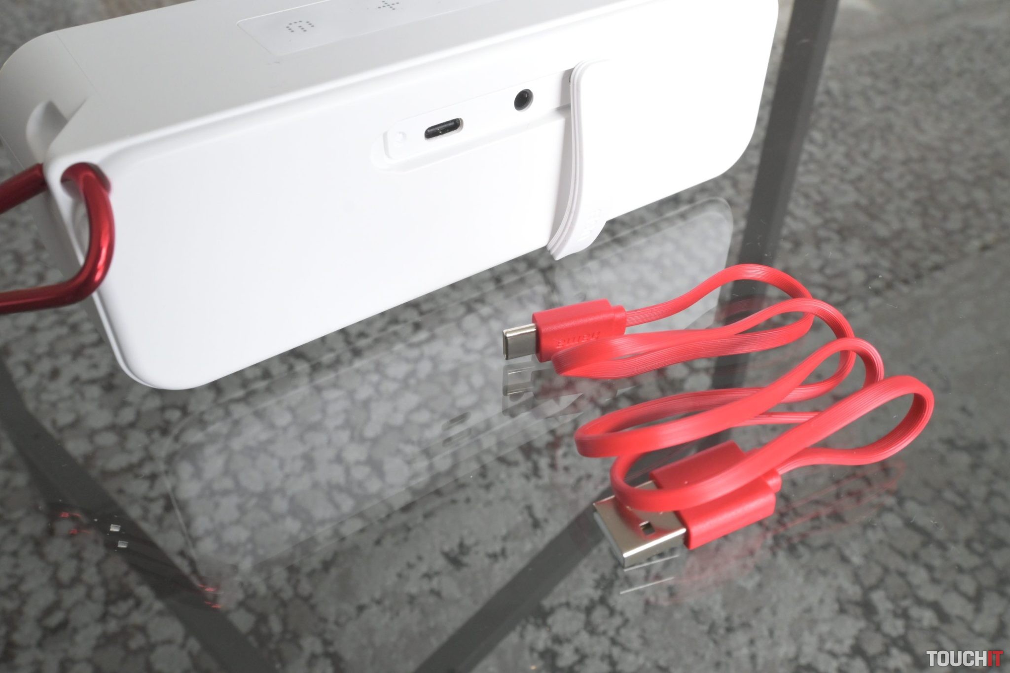 V balení ale tento typ kábla nie je. Okrem USB-C kábla na nabíjanie je tu ešte spomínaná karabína. Je na vás, či si ju na reproduktor pripnete. Oceňujeme, že nie je pevnou súčasťou. Na použitie v kancelárii bez potreby zapínania na batoh sa nám reproduktor osvedčil najviac a jej pevné pripojenie by nám sčasti prekážalo.