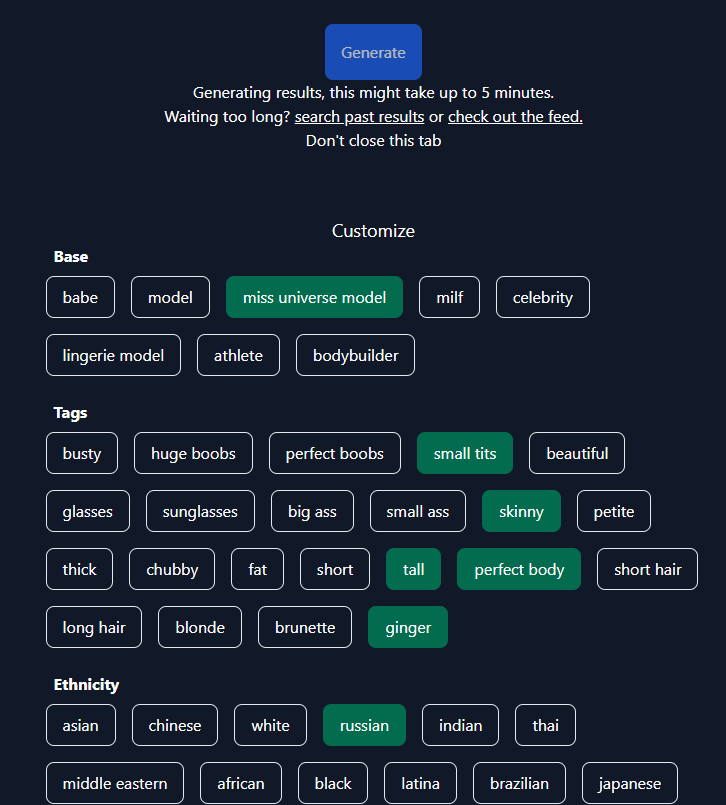 Filter toho, čo si môžete nechať vytvoriť je takpovediac úctyhodný. Vyberáte si formu základu, teda či chcete miss universe model, celebritu, lingerie alebo babe či iné. Nie sme v tejto oblasti experti a nerozumieme, v čom je rozdiel pri babe a model. Ďalej spresňujete parametre ako dĺžku vlasov, typ postavy a jednotlivých častí tela. Tiež si vyberáte, či chcete „bloncku“ alebo radšej ryšavku či brunetku.