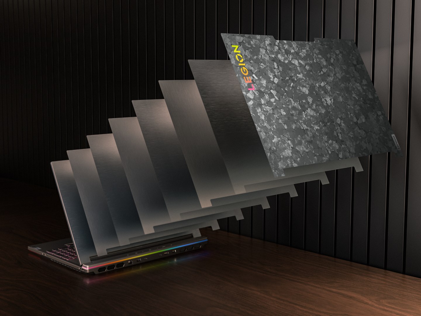Vrchný kryt vyrobený z plátov „forged carbon“ jednak šetrí hmotnosť, ale vďaka procesu výroby má každý Lenovo Legion 9i na vrchnom veku svoj vlastný unikátny vzor.